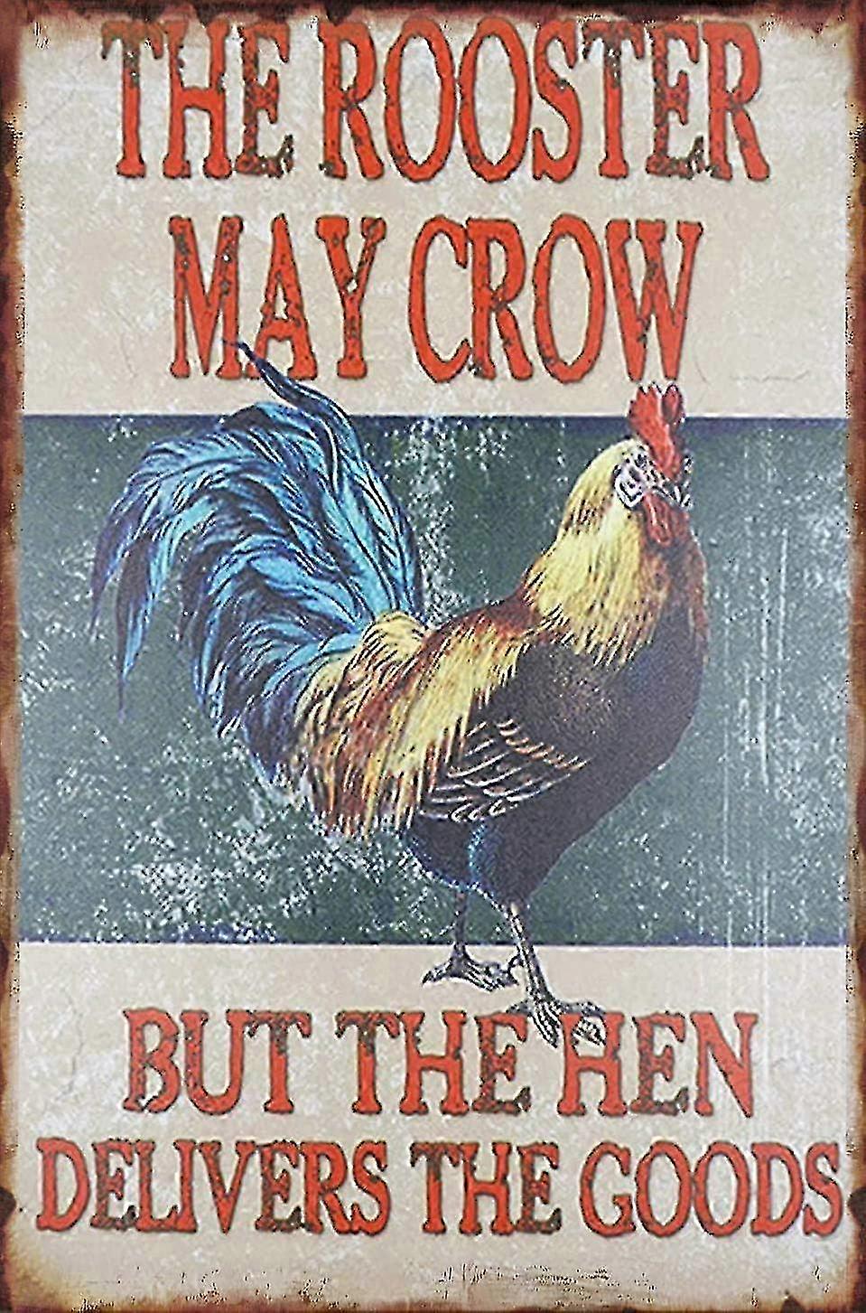 Gloryboom The Rooster May Crow But The Hen Delivers The Goods Chicken Metal Tin Sign Wall Plaque for Home Kitchen Bar Coffee Shop 8x12 Inch