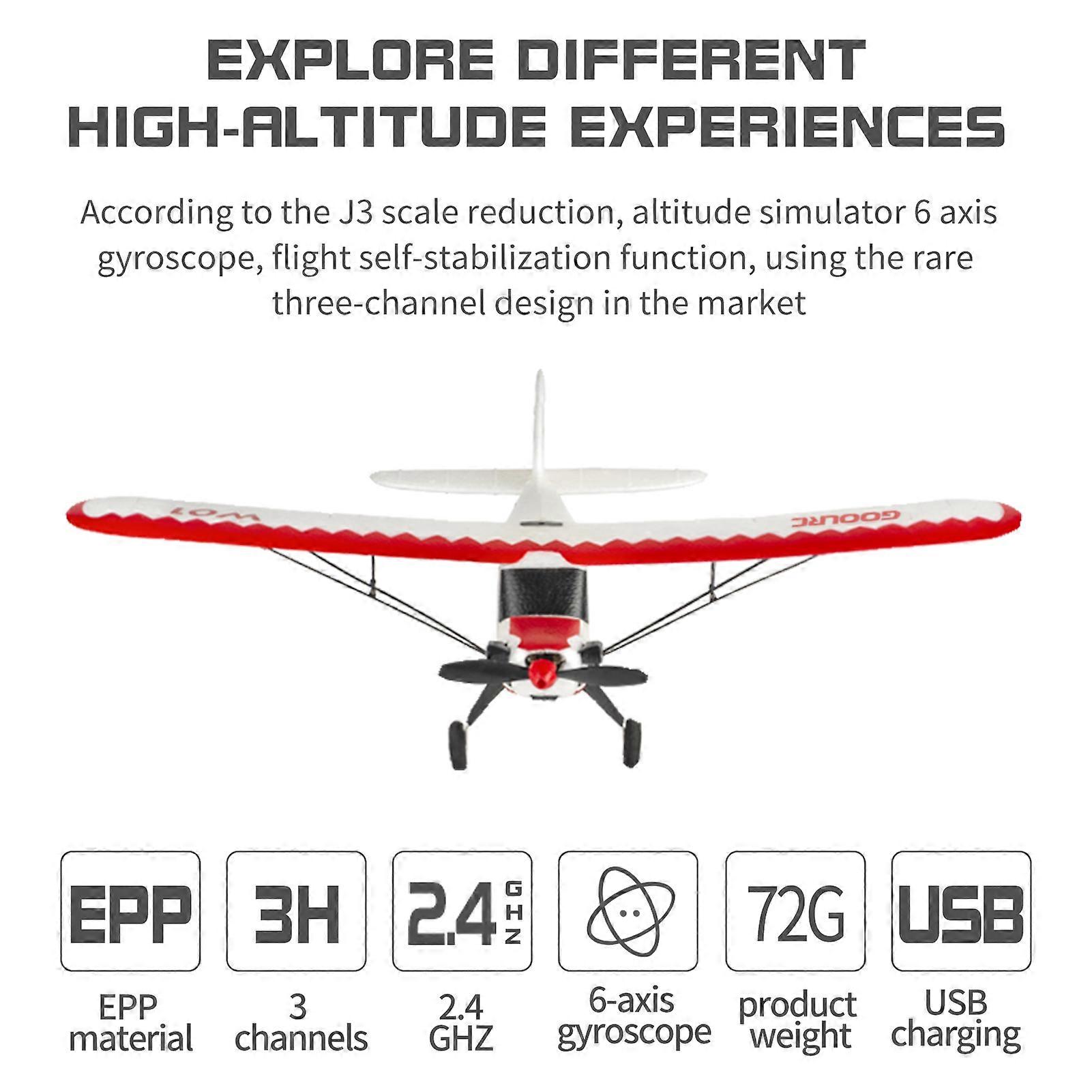 Feature: 1. More Stable Flight-According to J3 scale reduction, height simulator, six-axis gyroscope flight auto-stable system, flight more stable. Designed according to aerodynamic principle to provide strong power and self stability. 2. 3CH \u0026 2.4GHz-3 channel remote controller with LCD display. Adopting 2.4GHz communication protocol, the satellite receiver can be expanded to support DSMX DSM2 PPM S-BUS system. 3. More Precise Control-The use of high efficiency 2G digital servo, high torque response, fast precision, high return precision features, response speed of 60 ° / 0.08ms, make the aircraft fly accurately, feel good, longer life. 4. More Powerful-0720 coreless motor is used, three motors drive one main propeller, reflecting the characteristics of high torque, more powerful and high efficiency. The specially made high temperature resistant magnetic steel can withstand 150 ℃ high temperature without damage. 5. Solid Material-Super tough EPP material, optimize structure, reduce damage probability. The propeller made of ABS + PC composite material with high strength, good toughness, impact resistance, no deformation and durability. 6. Warranty: If there are any problems, please contact our store in time. We will give you a satisfactory solution. Specification: This RC airplane is made of EPP material, durable and light. 3-channel design, easier to control. The utility model has the advantages of high efficiency, power-saving, and long flight time. Also, it is a good gift for your children, it is good for both interest cultivation and intelligence development. Features: More Stable Flight-According to J3 scale reduction, height simulator, six-axis gyroscope flight auto-stable system, flight more stable. Designed according to aerodynamic principles to provide strong power and self-stability. 3CH & 2.4GHz-3 channel remote controller with LCD display. Adopting a 2.4GHz communication protocol, the satellite receiver can be expanded to support DSMX DSM2 PPM S-BUS system. More Precise Control-The use of high efficiency 2G digital servo, high torque response, fast precision, high return precision features, the response speed of 60 ° / 0.08ms, make the aircraft fly accurately, feel good, long life. More Powerful-0720 coreless motor is used, three motors drive one main propeller, reflecting the characteristics of high torque, more powerful and high efficiency. The specially made high temperature-resistant magnetic steel can withstand 150 ℃ high temperature without damage. Solid Material-Super tough EPP material, optimize the structure, reduce damage probability. The propeller made of ABS + PC composite material with high strength, good toughness, impact resistance, no deformation, and durability. Warranty: If there are any problems, please contact our store in time. We will give you a satisfactory solution. Specifications: Brand: GOOLRC Model: W01 Item: RC airplane Main color: White, red Material: EPP Channel: 3CH Motor: 0720 coreless motor(brushed) Frequency: 2.4Ghz Battery: 3.7V500mAh Remote control battery: 4* AAA battery(not included) Charging time: 60min Fly time: 25min Remote control distance: 120m Assembled size: 505*356*150mm Note: * Please read the instructions carefully before use. * Don't over-charge or over-discharge batteries. Don't put it beside the high-temperature condition. Don't throw it into the fire. Don't throw it into water. * There could be some deviations due to manual measurement or slight color difference owing to photographing condition. Thank you for your understanding. Package Information: Package size: 49*22*11.5cm Package weight: 617g Gift Box Package Packing List: 1* RC airplane(needs to be assembled) 1* Battery 1* Remote controller 1* Charging cable 1* Screwdriver 1* Spare propeller 1* Use manual Package List: 1* RC airplane(needs to be assembled) 1* Battery 1* Remote controller 1* Charging cable 1* Screwdriver 1* Spare propeller 1* Use manual