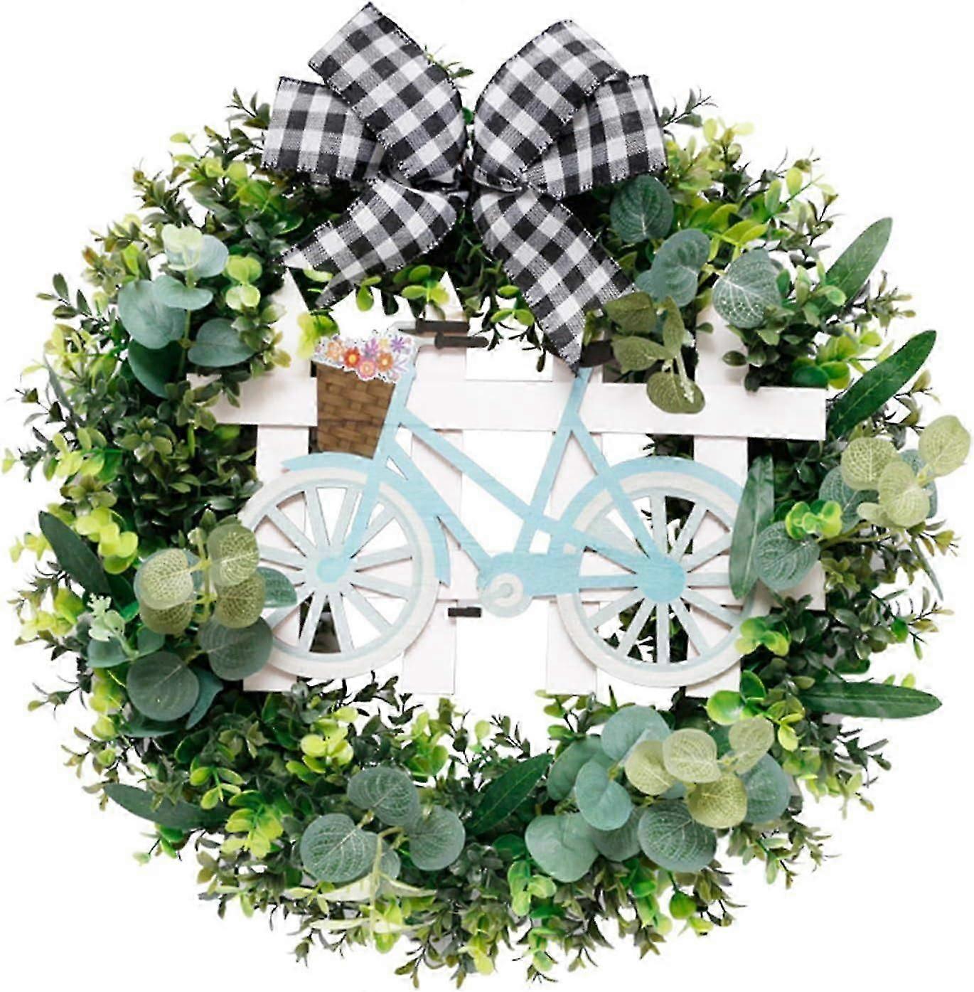 Heyone 19 Inch Artificial Green Leaves Wreath, Romantic Handmade Garland with Bow Knot and Bicycle for Spring Garden Home Front Door Decor Hanging Gre