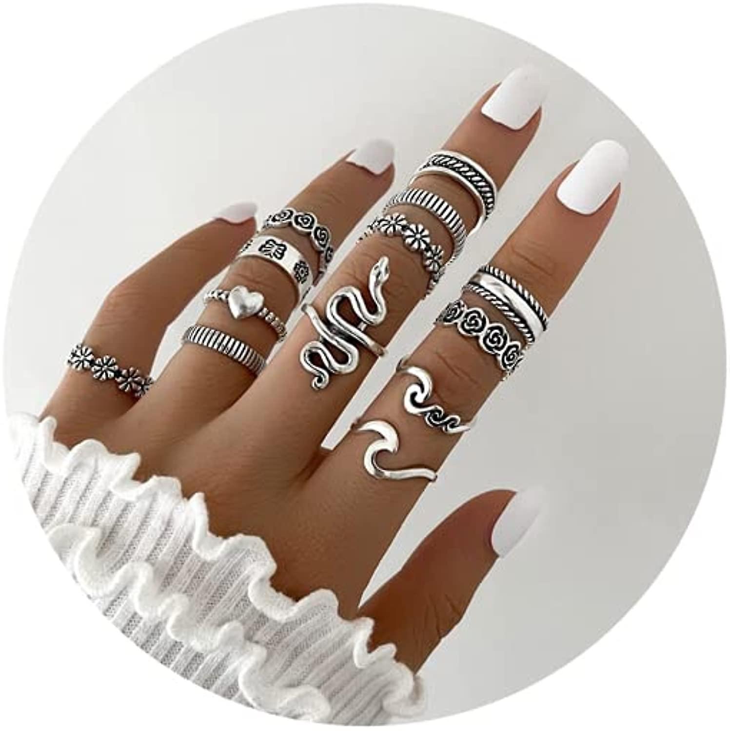 Heytea Knuckle Stacking Ring Set Boho Hollow Flower Ring Snake Ring Geometric Ring Set Vintage Punk Finger Ring Set for Women Girls Jewelry Gift