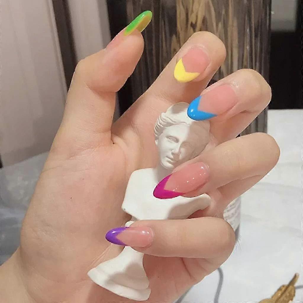 Heytea French Press On Nails Medium Length Glossy Oval Fake Nails Rainbow Nails Design Full Cover Acrylic Nails 24pcs(rainbow) Zekai