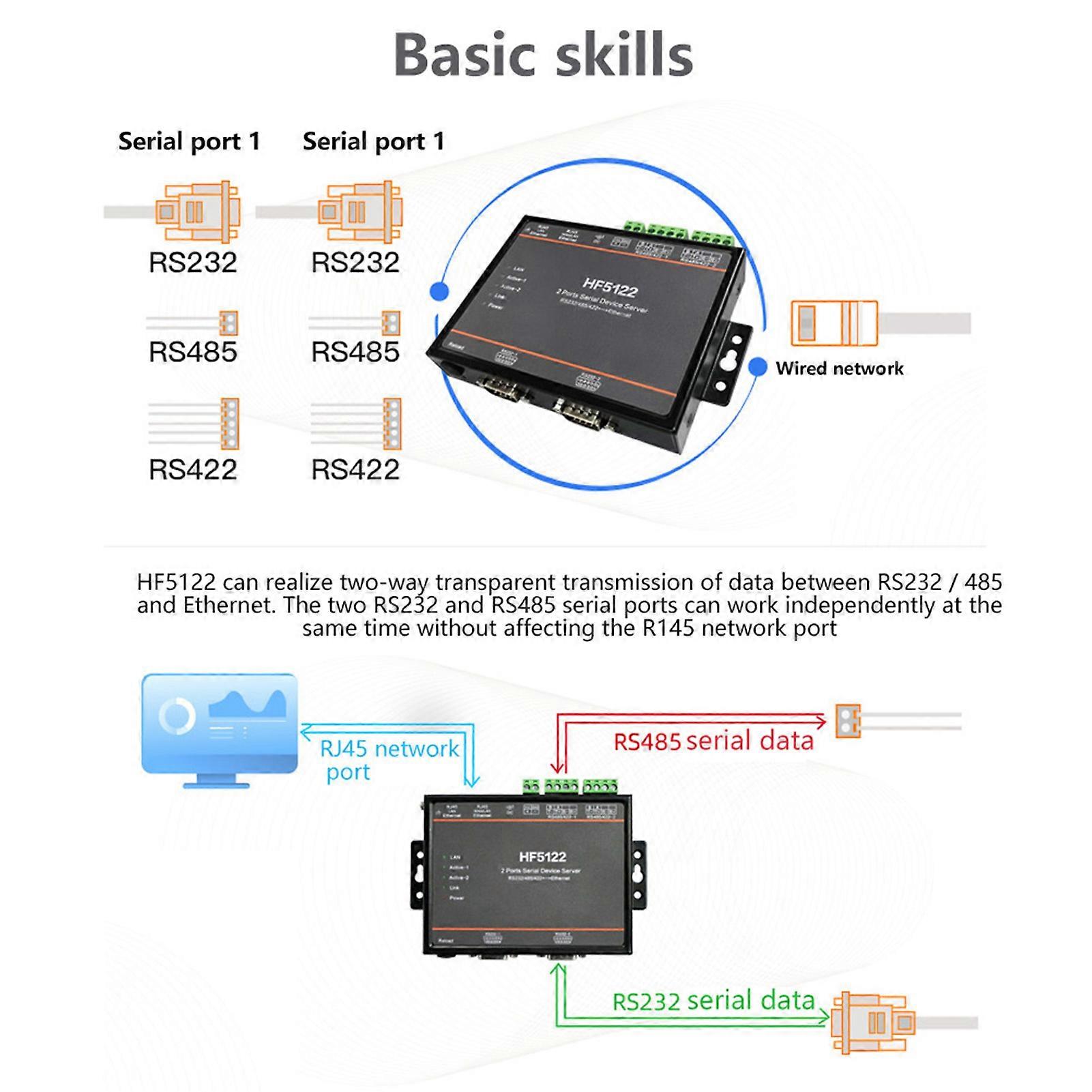 HF-5122 Dual Serial Port to Ethernet RS232 / RS485 / RS422 Serial Server 5 - 36VDC Item Type: Serial Server Model: HF5122 Interface Form: φ5.5 * 2.1mm socket and 5.08mm terminal block Power Protection: Anti-reverse power supply Working Current: ~ 300mA Power Consumption: <700mW Processor / Frequency: MIPS / 320MHz Flash / SDRAM: 4MB / 8MB Operating System: For eCos Port: 2RJ45 1 WAN / LAN switchable 1 LAN Network Transformer: Integrated Network Protocols: IP, TCP, UDP, DHCP, DNS, HTTP Server / Client, ARP, BOOTP, AutolP, ICMP, Telnet, uPNP, NTP Security Protocol: for AES-128Bit, DES3, for SSL / TLS v1.2 Number Of Serial Ports: 2 (RS232 / 485/422) Interface Standard: RS232: DB9 pin type RS485 / RS422: 5.08mm terminal block