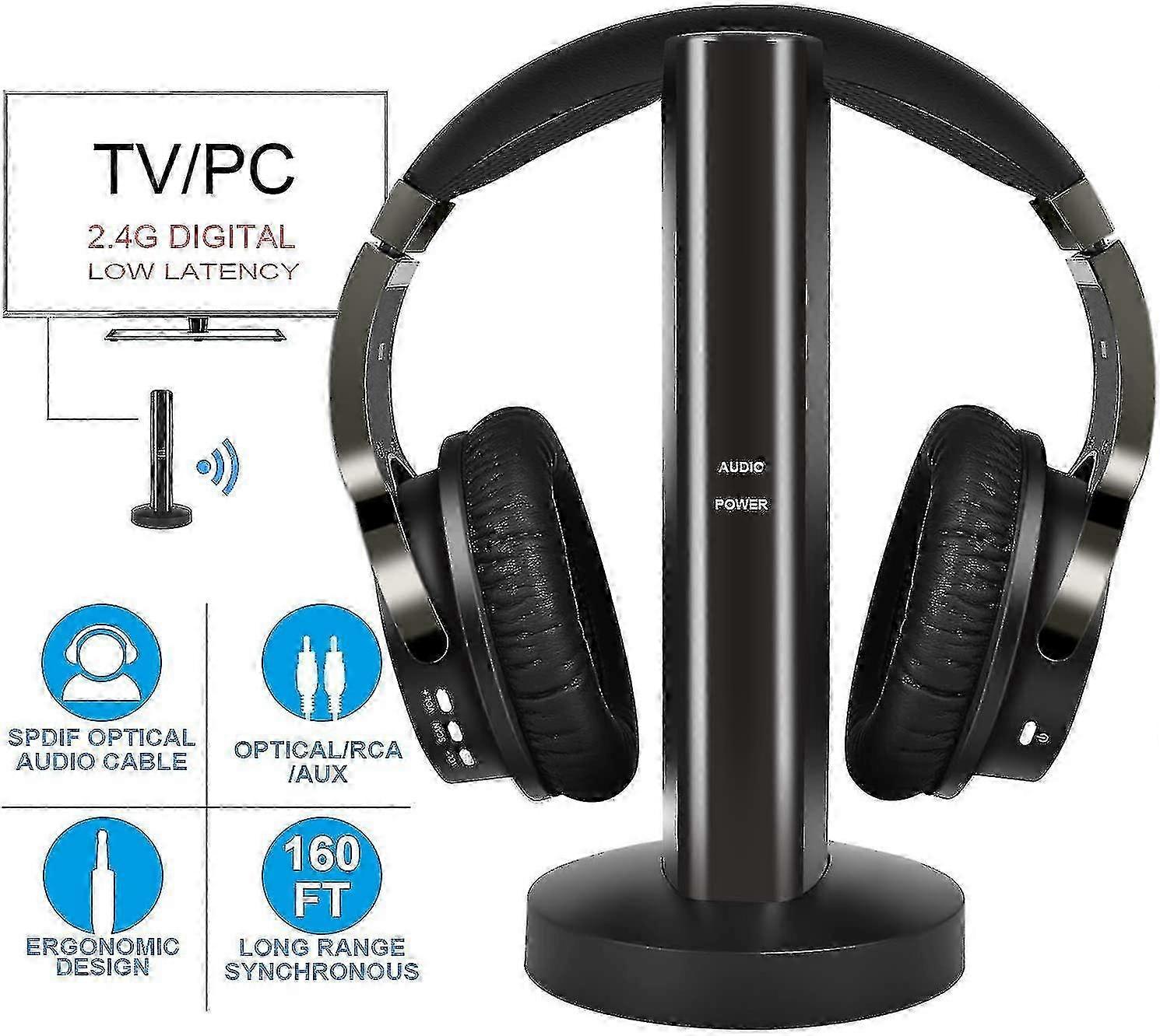 On-Ear Wireless Headset for Home TV and Gaming Featuring Hi-Fi Audio 2.4G RF Transmitter and RCA/3.5mm/Optical Connectivity