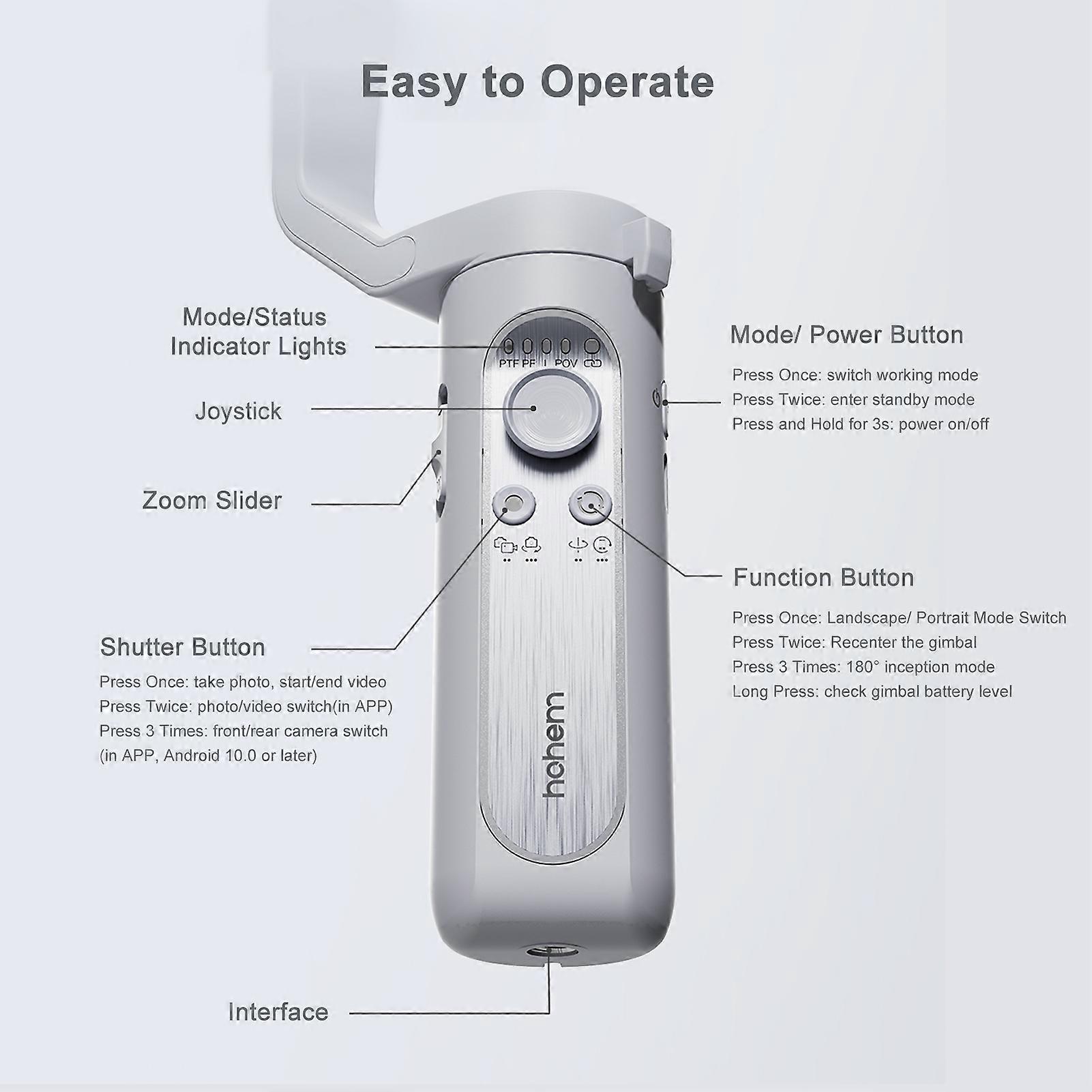 【Simple Operation】Only 4 control buttons and one joystick, easy e; One key switch horizontal and vertical mode. Beginners can also quickly get started. And you can download "Hohem Joy" APP to get more functions and create more professional videos.