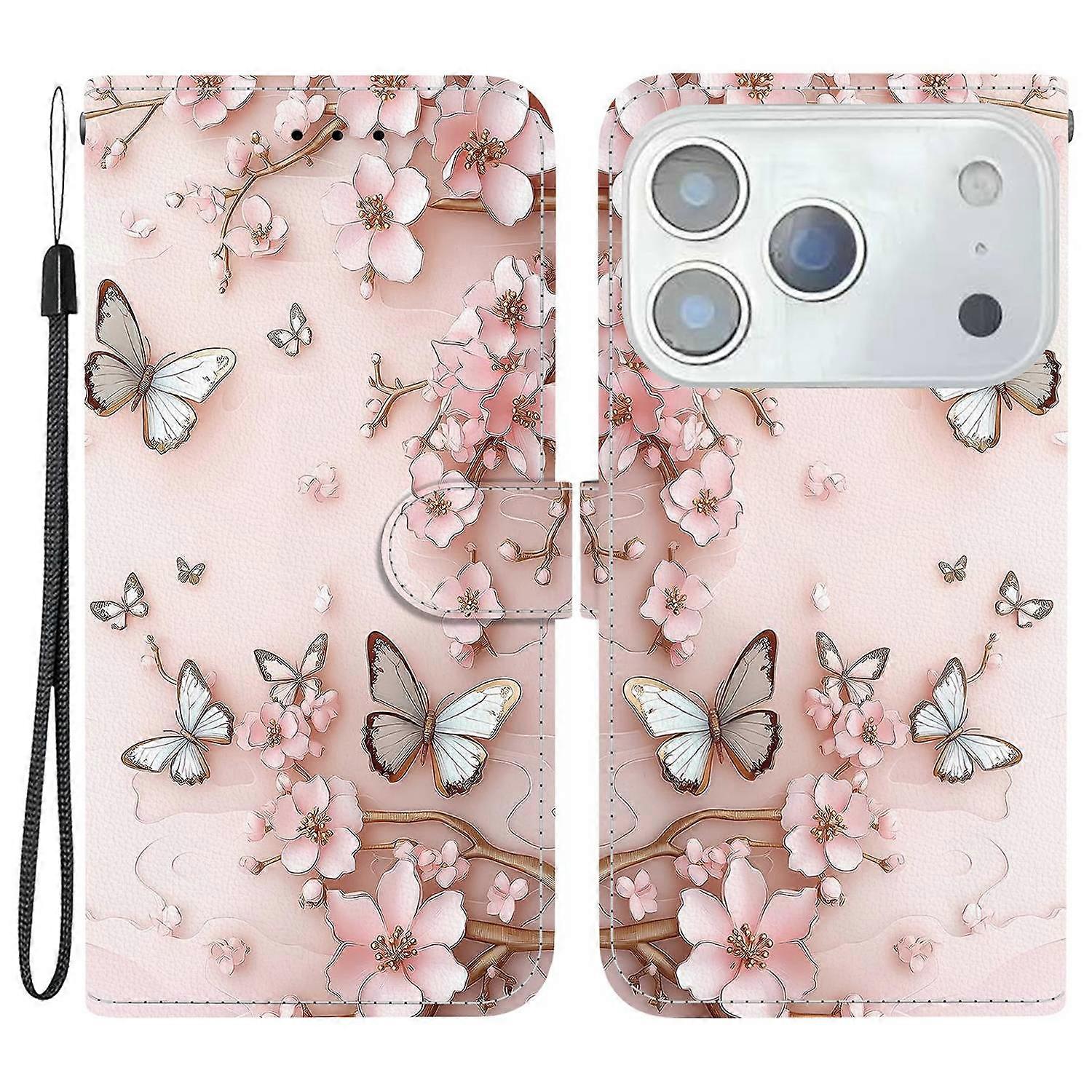 For iPhone 17 Pro Wallet Case Pattern Printing Leather Stand Phone Cover with Strap - Pink Butterfly