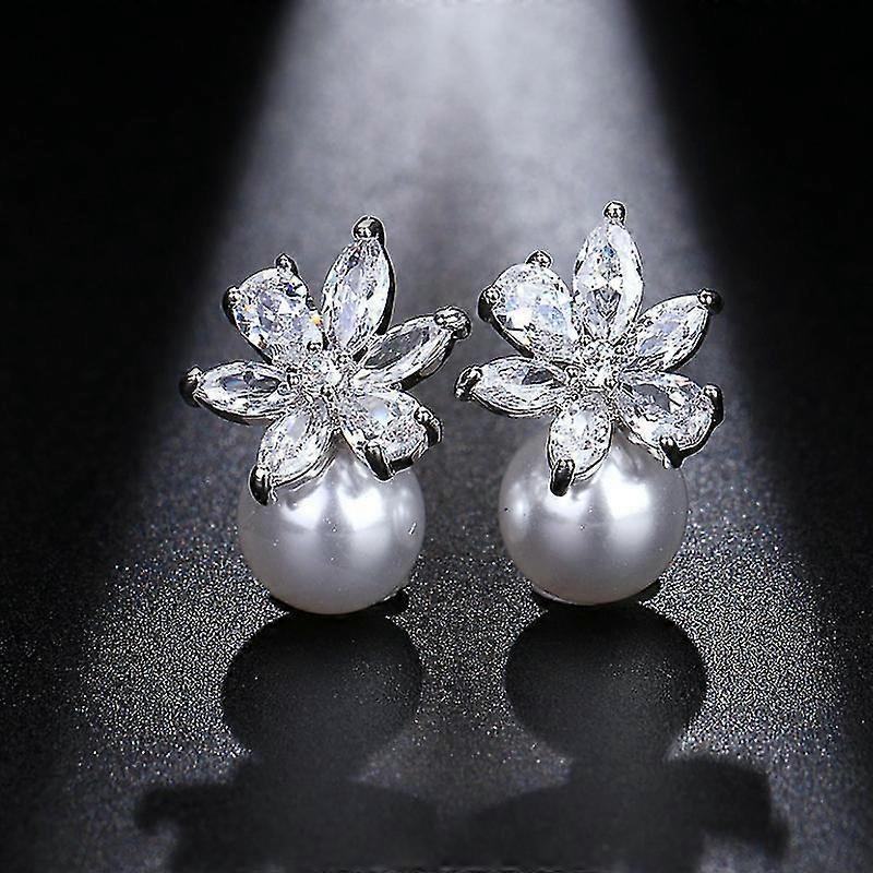 Jianghuo Elegant Exquisite Aaa Zircon White Crystal Flower Pearl Earrings For Women Wedding Party Gifts Jewelry