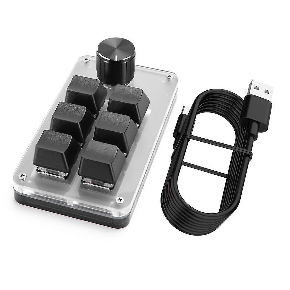 _x005f_x000D_ Specification: _x005f_x000D_ _x005f_x000D_ Material: acrylic _x005f_x000D_ Specifications: wired white, wired black, Bluetooth-compatible white, Bluetooth-compatible black (optional) _x005f_x000D_ Current and voltage: DC 5V/1A _x005f_x000D_ Interface: Type-C _x005f_x000D_ Keys: 6 _x005f_x000D_ Knobs: 1 _x005f_x000D_ Axle: Outeum red switch _x005f_x000D_ Product size: 102x52x35mm/4.02x2.05x1.38in _x005f_x000D_ Product weight: 100g _x005f_x000D_ _x005f_x000D_ Product description: _x005f_x000D_ Programmable Keypad: All keys are programmable. All key functions of the standard for Windows keyboard can be set, and a complex combination of shortcut keys can be realized with one key. _x005f_x000D_ 6 keys and 1 knobs are programmable: 6 keys, the knob is pressed, clockwise rotation, counterclockwise rotation can be customized. The RGB LED colorful lighting mode can also be set to change different lighting effects (note: the Bluetooth-compatible model does not come with RGB lights) _x005f_x000D_ Knob function: The knob can set functions such as zoom in and zoom out, previous track, next track, volume up, volume down, pause, play, etc. The one-handed macro mechanical keyboard is easy to operate and easy to carry. _x005f_x000D_ Mini size, effectively saving desktop space. Detachable USB cable. You can connect a keypad (plug and play) and another keyboard at the same time on the same computer and they won't interfere with each other. _x005f_x000D_ Wide range of applications: The keyboard is suitable for office, gaming, music, media, industrial control, laboratory, production line testing and other fields, and is a good helper for many other types of users such as designers and video editors. _x005f_x000D_ _x005f_x000D_ Note: _x005f_x000D_ Due to the different monitor and light effect, the actual color of the item might be slightly different from the color showed on the pictures. Thank you! _x005f_x000D_ Please allow 1-2cm measuring deviation due to manual measurement. _x005f_x000D_ _x005f_x000D_ Included: _x005f_x000D_ 1x Keypad _x005f_x000D_ 1x Data Cable 1.Plug-and-Play Convenience: Elevate your computing with the programming macro custom knob keyboard, featuring a Type-C to USB interface for swift and seamless plug-and-play action. No drivers, no hassle-just reliable connectivity for Windows and for Mac (with initial Windows setup for Mac users). 2.Personalized Key Programming: Unleash your gaming potential with the one-handed mechanical gaming keyboard. Tailor every key to your liking with customizable settings, comprehensive instructional videos, and remote tech support from our dedicated customer service team. 3.Durable Mechanical Construction: The photoshop gaming keypad is built to last, with resilient mechanical key switches that withstand the test of time. An ergonomic design ensures comfort during prolonged use, whether you're editing, gaming, or controlling complex media. 4.Versatile Connectivity: Opt for adaptability with the mechanical hotswap macropad that not only provides hot-swappable convenience but also boasts wireless computer connectivity and Bluetooth-Compatible options for versatile command over volume and media. 5.Dynamic Lighting Options (Non-Bluetooth-Compatible version): Illuminate your desk with the mini mechanical BT keyboard's vibrant RGB lighting. Select from solid color, dynamic "marquee," or switch off entirely for lighting that's as unique as you are. Our customer service is on standby to help tailor your settings. (Note: The Bluetooth-Compatible version does not feature RGB lighting.)