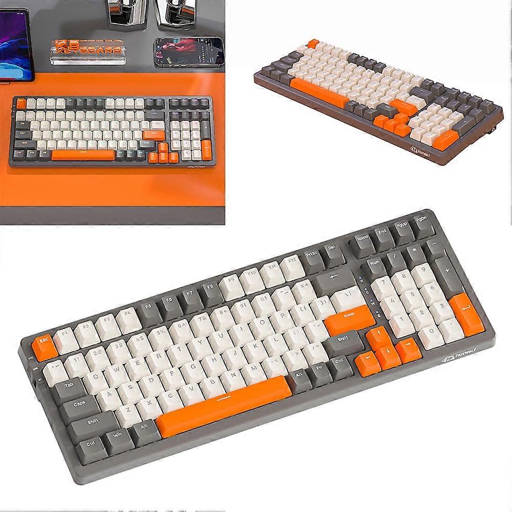 _x005f_x000D_ Specification: _x005f_x000D_ Origin: Mainland China _x005f_x000D_ Type: Bluetooth-Compatible Wireless _x005f_x000D_ Application: Desktop,Laptop,Tablet _x005f_x000D_ Keyboard Standard: 100 Keys _x005f_x000D_ Language: English _x005f_x000D_ Operation Style: Mechanical _x005f_x000D_ Interface Type: Bluetooth-Compatible/USB _x005f_x000D_ Style: Gaming,Ergonomics,For Laptop,Multifunctional Keyboard _x005f_x000D_ Package: Yes _x005f_x000D_ Backlight Type: MULTICOLOR _x005f_x000D_ Switches Hot swap: YES _x005f_x000D_ Name: Bluetooth-Compatible+2.4G+wired three-mode mechanical keyboard _x005f_x000D_ Color: gray and white, blue and white (optional) _x005f_x000D_ Shaft body: green shaft, red shaft (optional) _x005f_x000D_ Transmission method: Wired Type-C+5.0 Bluetooth-Compatible+2.4G wireless _x005f_x000D_ Number of keys: 100 keys _x005f_x000D_ Shaft: Quanjian hot-swappable _x005f_x000D_ Interface: Type-C interface _x005f_x000D_ Battery capacity: 3000mAh _x005f_x000D_ Working current: ≤200mA _x005f_x000D_ Working voltage: 5W±2.5W _x005f_x000D_ Lighting mode: 18 lighting effects _x005f_x000D_ Keyboard size: 36*14*4CM/14.17x5.51x1.57inch _x005f_x000D_ Box size: 41.4*15*4.8CM _x005f_x000D_ Product weight: 720G _x005f_x000D_ Product size: 360.00x140.00x40.00mm _x005f_x000D_ Product size: 14.17x5.51x1.57inch _x005f_x000D_ _x005f_x000D_ Note: _x005f_x000D_ Due to the different monitor and light effect, the actual color of the item might be slightly different from the color showed on the pictures. Thank you! _x005f_x000D_ Please allow 1-2cm measuring deviation due to manual measurement. _x005f_x000D_ _x005f_x000D_ _x005f_x000D_ Included: _x005f_x000D_ 1 X Mechanical Keyboard _x005f_x000D_ 1 X Data Cable _x005f_x000D_ 1 X Key Puller _x005f_x000D_ 1 X Usb Receiver _x005f_x000D_ 1 X Instruction Manual 1. Fast Response: Equipped with next-generation wireless transmission technology, this wireless mechanical keyboard ensures faster data transfer and key response, even in complex wireless environments, maintaining a quick and responsive performance. 2. Efficient Silence: With multiple layers of pads, EVA sound-absorbing cotton, and bottom cushion design, this keyboard minimizes hard collisions and cavity noise, providing an efficient and silent typing experience. 3. Space-Saving: Featuring a sleek and minimalist design, this keyboard saves desktop space and provides more usable area for mobile office setups, allowing for a clutter-free and organized workspace. 4. Long-lasting Battery Life: Paired with a high polling rate and a large lithium battery, this hot swappable mechanical keyboard offers low-latency performance and long-lasting battery life. It meets the demands of esports enthusiasts, ensuring worry-free gaming sessions. 5. Multi-function Switching: With support for three connectivity modes (Bluetooth-Compatible 5.0/wireless 2.4G/Type-C wired), this computer keyboard offers a versatile solution for different usage scenarios. Its clean and exquisite design allows users to easily switch between modes according to their specific needs.