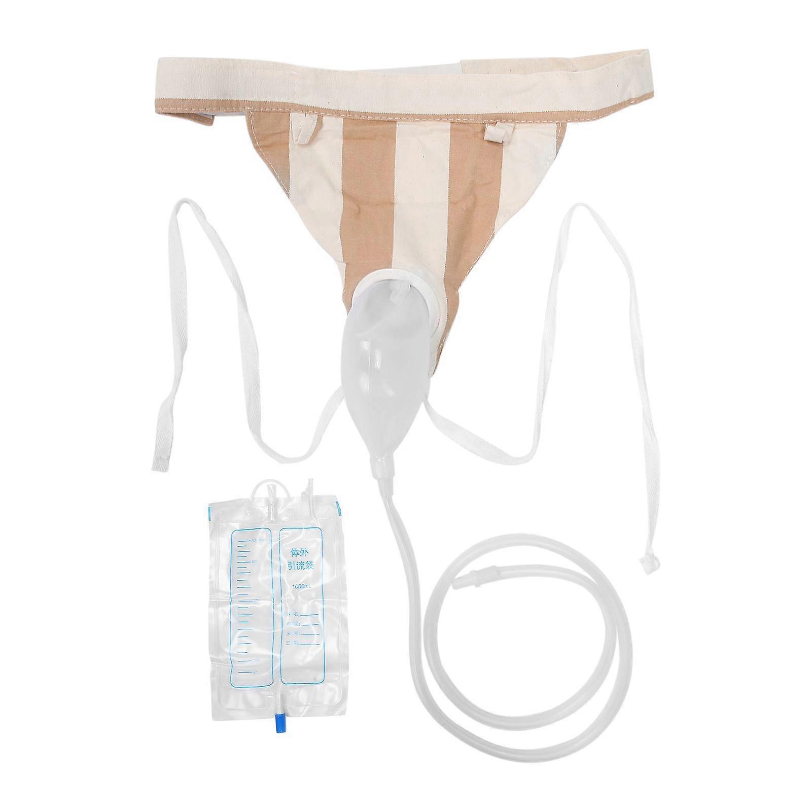 Features1Soft edge to prevent side leakage, good effect to prevent urine overflow and sleep at ease, easy and convenient for men use. 2Soft, skin?friendly, firm and durable material, delicate and non?friction, wonderful and comfortable wearing experience and durable. 3Breathable panties to enhance load?bearing capacity, 1000ml capacity, special designed for men, suitable for bedridden patient. 4Suitable for the old, weak, sick and disabled, fracture, paralysis, frequent urination, urgent urination, etc. 5Also suitable for people who are mental confusion, can not take care of themselves and other patients.SpecificationItem Type: Silicone Urine CollectorMaterial: Silicone + Cotton Cloth Urine Bag Capacity: 1000ml Scope of use:Suitable for the old, weak, sick and disabled, fracture, paralysis, frequent urination, urgent urination, urinary incontinence, mental confusion, can not take care of themselves and other patients. (it is recommended to buy 2 sets of alternate use, easy to clean)Usage:1. Flush the plastic urine bag with water or air first to prevent adhesion of the plastic urine bag, if the plastic catheter flattening, can use with warm water to solve the problem.2. Tie the elastic fixing belt to the waist, and aim the ureteral opening at the notch of the urine bag.3. The two long bags are separated from the middle of the roots of the legs to the left and right, and connected with the two short belts upward in the back. Open the exhaust switch on the plastic urine bag, and hanging the plastic urine bag on the bedside, and you can use it.Note: 1. Contact the urethral opening closely with the opening of the catheterization bag to prevent leakage of urine.2. The catheterization bag is closely connected with the plastic catheter.3. No matter in any position, the plastic catheter should be lower than the position of the catheterization bag, and avoid the distortion of the catheterization bag and plastic catheter.4. Long-term use, urine collector and skin contact place to keep dry and cleaning.Storage: The packaged urine collector should be placed in a dry, well-ventilated room without harmful or corrosive substances.Keep away from heat.Package List1 x Urine Bag 1 x Panties (Including Catheter) 1 x Manual