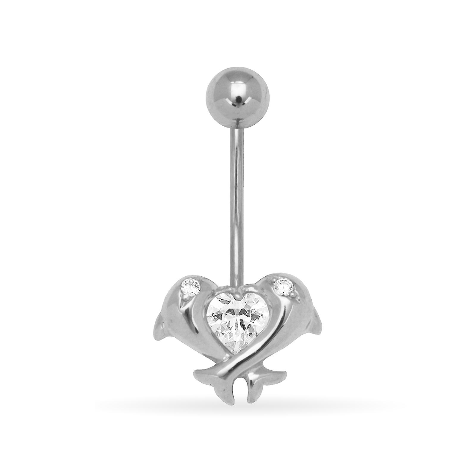 14k White Gold Cubic Zirconia 14 Gauge Dangling Dolphins Body Jewelry Belly Ring 24x11mm-Body Piercing-Ring for Women