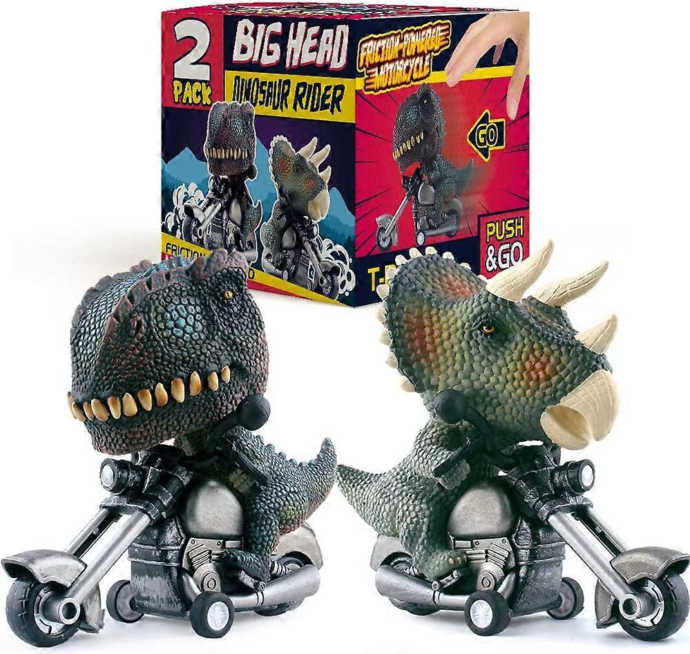 [2-Pack DINOSAUR MOTORCYCLES] Dinosaur friction-powered toy cars featuring 2 big head dinosaur rider motorcycles. Dinosaurs include T-Rex and Triceratops. The design of realistic dinosaur and vehicle combination makes a cool dinosaur toy for boys.[REV THEM UP AND LET THEM GO] The simple push and go dinosaur motorcycles are easy for children to play. Using friction-power wheel to rev up the dino and it will go fast. The dino rider on motorcycles make playing dinosaur games mighty fun.[IDEAL SIZE FOR CHILD] The dinosaur toy motorcycle measures 5\u201d in size. The dinosaur bikes easily fit in the hands of children ages 3 and up. Our dinosaur toys foster imagination and creativity for 3 year olds boys and toddlers.[ADORABLE & WELL MADE] The realistic dinosaur figures are carefully crafted and hand painted with vibrant detail, made of soft plastic with rounded edge that will never hurt your children. Kids will love to race the dinosaur in the room.[FUN DINOSAUR TOY GIFTS] Dinosaur motocycles are packed by a color gift box. Excellent party favor or a winning prize at a dinosaur themed party. Great birthday gift or a special toy to gift to any children who love dinosaurs.