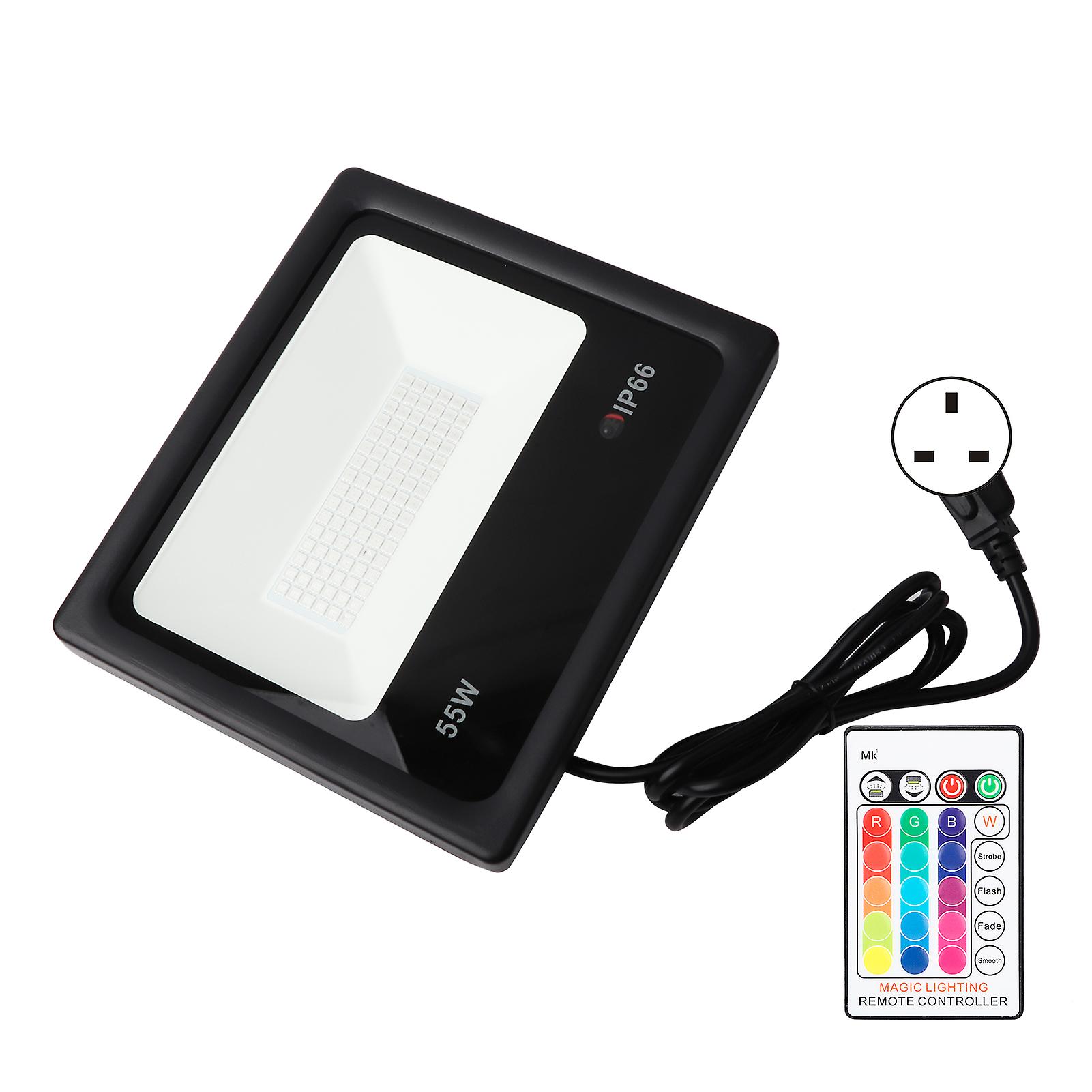 1、Remote control distance: 10 meters to 12 meters (actual sensing distance). There are 16 static monochrome modes to adjust the brightness. Flash, strobe, etc. 2、The bracket can be rotated 180 °, can be placed on the ground, or can be installed on the wall for easy installation. 3、The workmanship is exquisite and lightweight. Made of quality material, corrosion and crack resistance, not easy to rust. 4、96 light chip, uniform light emission, high brightness and strong stability. 5、Suitable for outdoor, lawn, courtyard, driveway, road, landscape facade, garden, hotel, etc. 6、Wide voltage band drive AC85-265V, universal. IP66 waterproof grade, and waterproof rubber gasket, good waterproof performance. 1 x Floodlight1 x Remote control1 x Instruction Condition: 100% Brand NewItem Type: LED FloodlightMaterial: die-cast aluminum + tempered glass + electronic componentsProduct Color: As picture shownPower cord length: Approx. 1.5m/ 4.9ftProduct size(length x width x height): Approx. 23x 19.5x6cm/ 9.1x 7.7x 2.4inWeight: Approx. 1485gLight source: colorful light soucePower: 55WWaterproof grade: IP66Light chip quantity: 96/4950lmVoltage: AC85V-265VBattery: remote control 1 x cell battery CR2025 3V(not included)