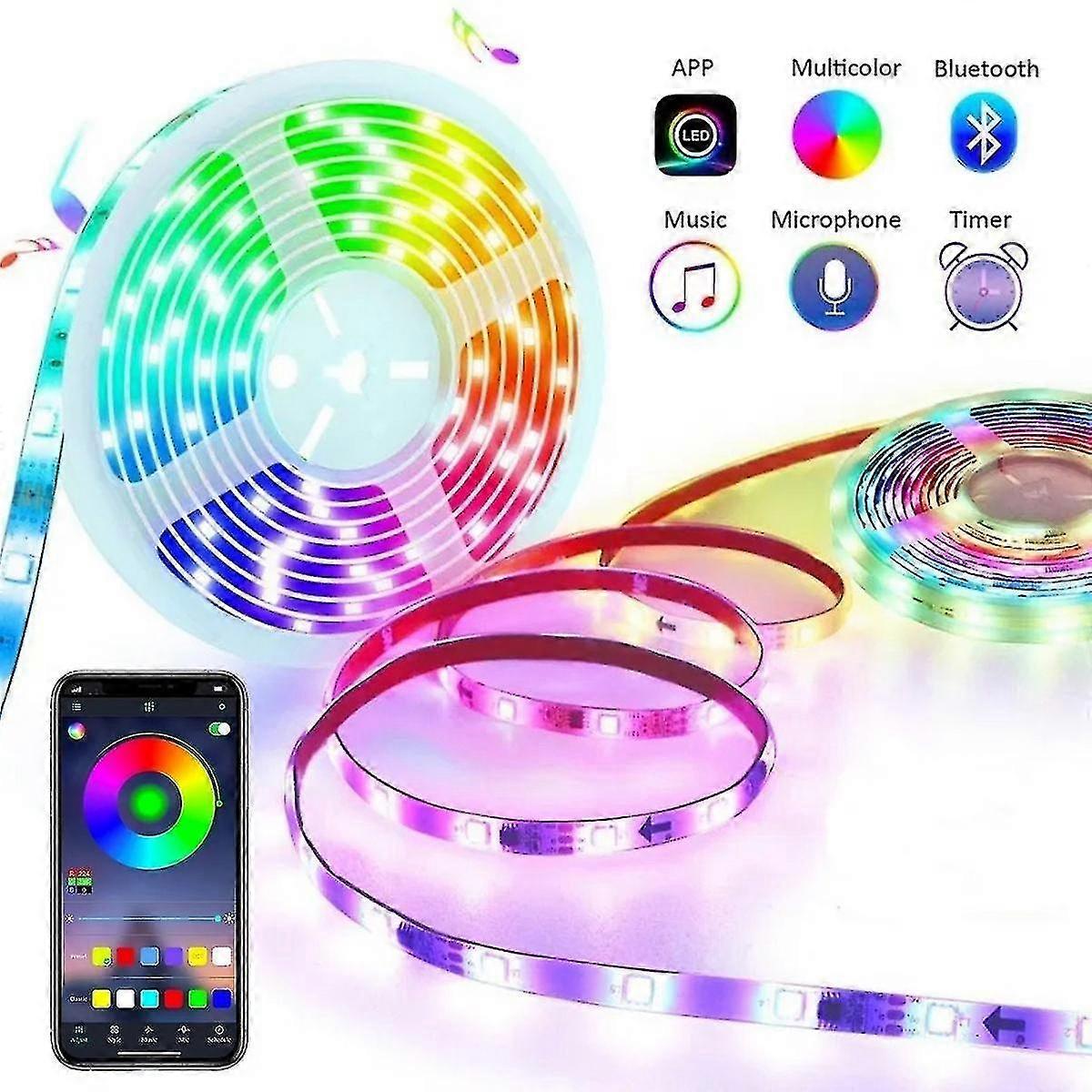 1. Bluetooth LED Strip 5m APP Waterproof Controlled Decorative LED Strip Lights / 60LED 5050 RGB LED Waterproof Multicolor USB TV Backlight LED Strips Sync to Music Lighting for Home and Outdoor Decoration2. SMART CONTROL - The LED strip light has 60 5050 RGB Leds, smart phone APP control, perfectly compatible with iPhone and Android iOS phone, easily dim and switch, offers smart lifestyle, the Effective receiving distance is 8 ~ 10m. There are also 4 dynamic switching modes (Flash, Strobe, Fade, Soft) in which you can select the switching speed for the LED band.3. MUSIC APP AND MIC MODE - Take complete control of your lighting with the smartphone app "duoCo Strip", you can choose from 16 million colors. Create romance, relaxation, party atmosphere with music and microphone, and sports function, the color of the lights will change with the musical rhythms or your microphone. Adjust the light brighter or darker. I think this will make your party more impressive.6. IP 65 WATERPROOF - IP 65 waterproof, available both indoors and outdoors even on rainy days. Silicone material, good light transmission, smooth texture, good toughness, it can be bent into any shape you want.NOTE: the led strip is waterproof but the power supply is not.7. EASY TO INSTALL - All in one kit, comes with a remote control receiver, 2m light strip, and 3M self-adhesive tape; you don't need any other expensive devices; Waterproof strip lights suitable for indoor and outdoor decorations, mounting with 3M adhesive tape included in the lighting kit, enjoy a relaxing and relaxing atmosphere.8. WIDE APPLICATION - Our LED strip lights can be used to decorate your dining room, bedroom, upstairs, kitchen, porch, computer desk and living rooms, especially great for parties and events such as Christmas, Halloween, parties and more . It is a great gift for your family and friends.9. 16 Million Colors & Brightness and Speed AdjustmentYou could choose from 16 million colors, and pre-programmed style modes that make your party more wonderful, creating a party of romance, relaxation and atmosphere.You could also adjust the brightness and speed of the lights from 1% to 100% to suit different scenes. High brightness for lighting, medium brightness for atmosphere, low brightness for sleeping.Cut As You LikeThe led strips have a length of 5 meters and can be cut every 3 LEDs, on the surface there are cut marks.