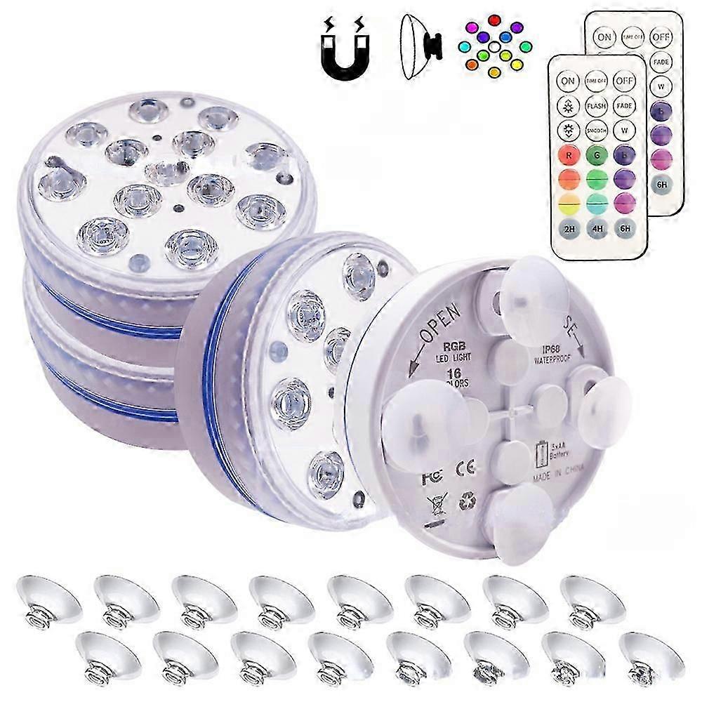 color: White Size: 7.5cm in diameter, 8cm in diameter Material: ABS+PC Weight: 7cm: 150g, 205g, 400g, 8.5cm: 171g, 262g, 600g Specifications: 1 light + 1 remote control, 2 lights + 1 remote control, 4 lights + 2 remote control Shell material: PC Luminous flux: 195 Input voltage: 4.5v Life: 50000H Protection class: IP68 Application: Aquarium lights, swimming pool decoration and atmosphere decoration