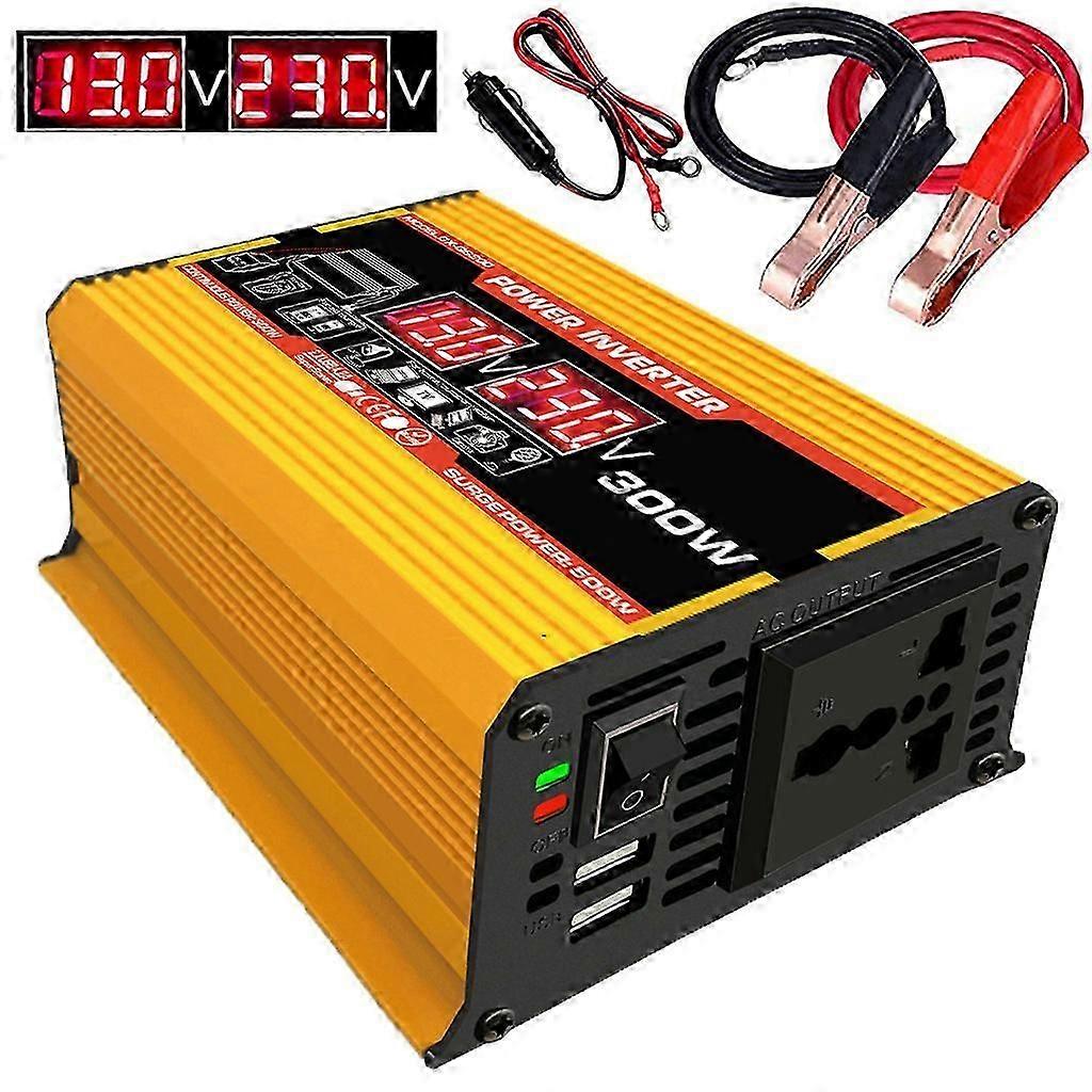 Specifications:Name: Car power inverter 300W.Input voltage: DC 10.5V~15V,(When the battery voltage is lower than 10.5V, the inverter is low voltage protection, when the battery voltage is higher than 15V, the inverter high voltage protection).Output voltage : AC 220V/110V for your choice.Output frequency: 50Hz/60Hz.Peaks Power: 600W.Rated power: 300W.Output waveform: Modified sine wave.Product Size: 16.5X11.2X5.6cm.Adavantage:[Power inverter] Car power inverter with 2 USB ports and AC outlet. The power inverter comes with free cigarette lighter and 2pcs battery clips, providing 300Watt continuous power, 600Watt peak power (Please make sure that the total rated power of the connected devices is 300W).[LED Green&Red Work Lights] When inverter work normal, the green LED Lights work and tell you it is working well, but when it is on protection status, such as low voltage, high voltage, over temperature, or over load, the Red Led Lights will light up and you need to turn off the inverter, and check which protection function is work, and try to solve it then the inverter can work again.[LED Voltage Screen display] LED Display shows the battery Input voltage, output voltage. Cigarette lighter cable can supply power for device easily. If the out put power is higher than 150W, please using the Crocodile Clips to a battery.[Fast Charging Dual USB ports ] One AC Outlets and two usb ports can offer 100% fast charging for Mobile phones, computers, laptop,breast pump, Nebulizer,Razors,medical rescue device,emergency equipment etc,can be as a Emergency Power Supply.[Multi Protection] Built-in fuses, safe charging design and cooling fan prevents the car power converter from over-heat,saving power and energy.over voltage, overload, over-current, short circuiting, under-voltage, overheating, short circuit protection.[Lightweight design &Top Quality] Lightweight and compact, ideal for vacations, camping and work trips. It can be plugged into almost any 12V power output vehicle, providing charging opportunities anywhere.Application:-Applicable Loads for Rated Power under 300W:5W-Cell phone.5W-Breast pump.10W-Digital Electronics(Ipad/Car navigation/Digital camera).10W-Game console.5W-10W Electric shaver.20W-LED Lamp.25W-Walkie talkie.50-100W Laptop.60W-Compact Fluorescent Lamp.60W-Incandescent lamp.60W-Mechanical Electric9 Fan.60W-150W TV .80W-VCR.180W-Desktop Computer.