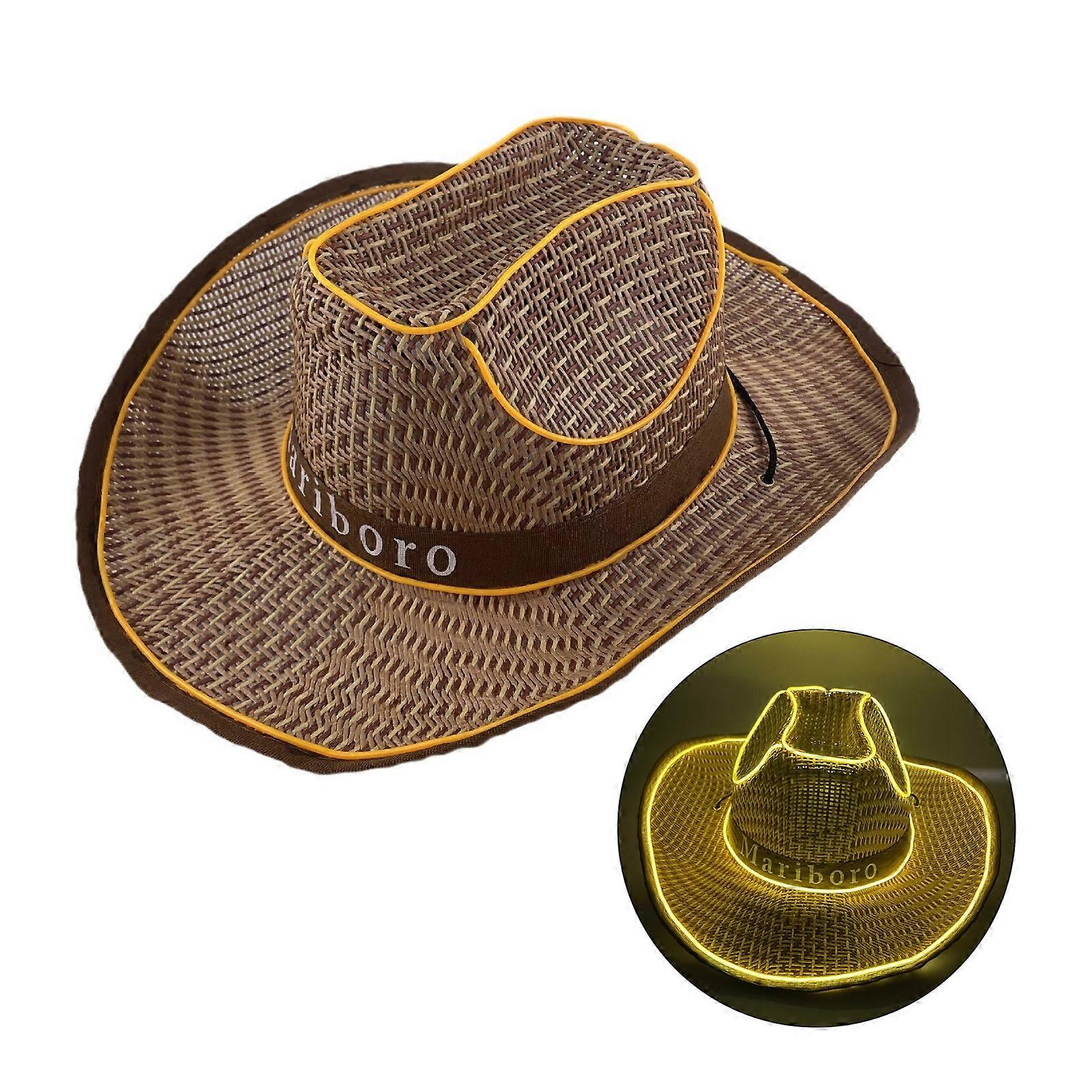 LED Flashing Cowboy Straw Hat Large Brims Glowing Club Hat Adult Stage Performances Hat Theme Party Headwear Yellow