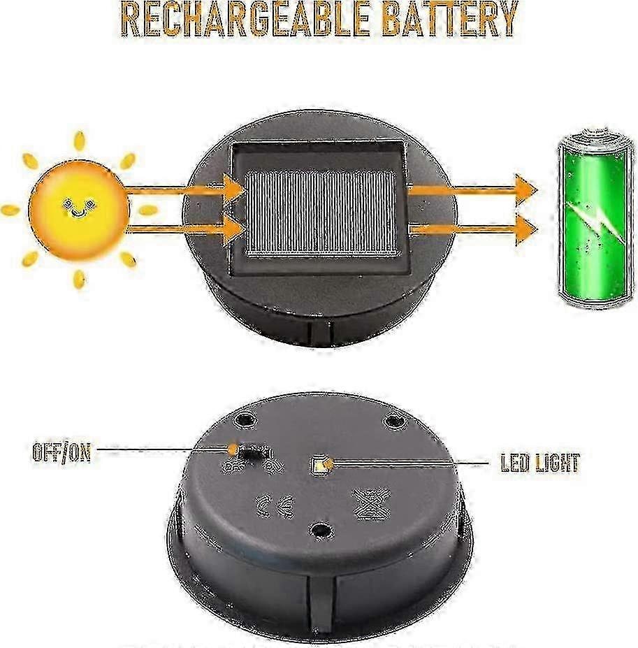 [Perfect Replacement Parts for Garden Lights]: This replacement solar light with LED bulbs is approximately 8cm in diameter and will fit most garden lights. When installing, simply remove the old compartment battery operated and insert the replacement solar light on top to enjoy beautiful light effects.Automatic solar lighting: Replace solar lights with LED bulbs and use large solar panels, which simply absorb light during the day and turn on automatically at dusk. Replacement of the solar lamp When fully charged, the upper part can light continuously for 6-12 hours.[IP65 Waterproof]: The replacement solar light with LED bulb is designed to be waterproof and works well even in stormy weather. (Storm weather may cause insufficient power supply for replacement due to lighting insufficient)[Easy to install and use]: The installation of the solar replacement lamp with LED bulb is very simple, just plug in the solar replacement lamp with LED bulb. LED solar panel shade with switch, can be turned off when not in use to save energyOur products are made with the highest quality materials and are designed to provide you with the best possible user experience. We strive to ship out all orders within three days of purchase, and the estimated delivery time is 8-15 days.When shopping, please pay attention to the size and dimensions of the product to ensure that it meets your needs. In the title and , we have provided detailed information about the product, including its features and specificationsWe want you to be completely satisfied with your purchase, so if you have any questions or concerns, please don't hesitate to contact us. We are here to help and will do our best to assist you.Thank you for choosing our product. We hope you enjoy it Note: Due to the light and screen setting difference, the item's color may be slightly different from the pictures. Please allow slight dimension difference due to different manual measurement.