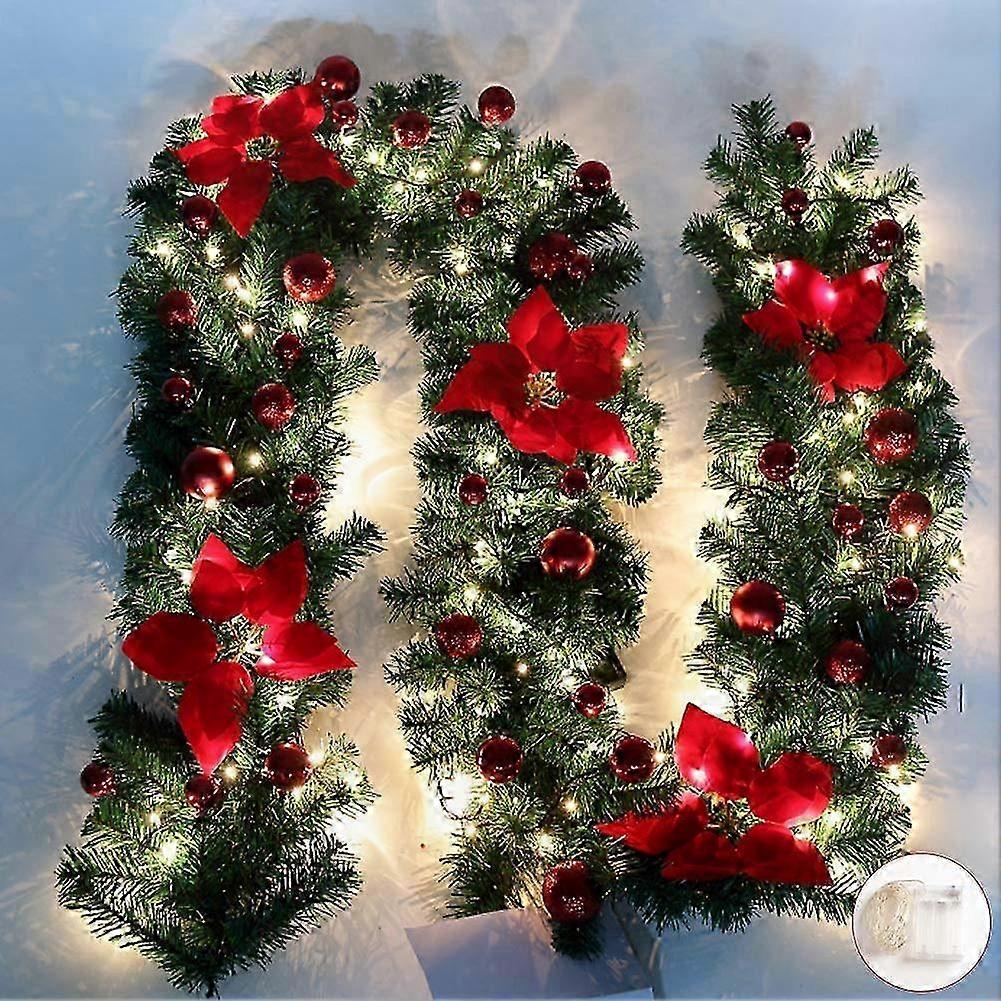 LED Christmas Garland with Red Balls and Flowers for Front Door, 270cm Decorative Wreath with Lights