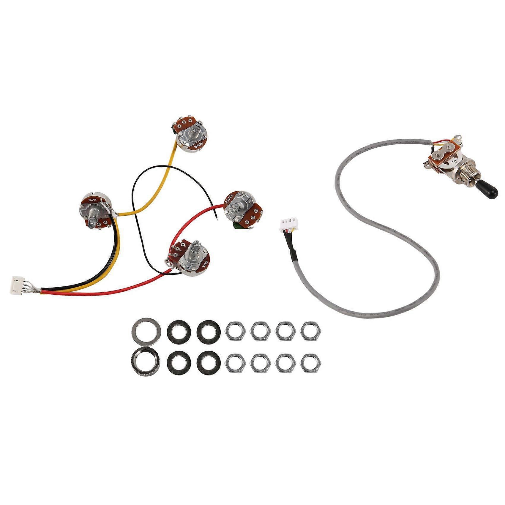 and high end luthier supply components The kit comes with wiring diagram and everything you need to wire up your guitar Convenient, easy to use and secure Compatible for Les Paul Epiphone Electric Guitar Parts colour:Silver + black cap Material:Metal + ABS Package Contents: 1* Wiring Harness 2 *A500k Pots 2* B500K Pots 1 *3 Way Switch Only the above package content, other products are not included. Note: Light shooting and different displays may cause the color of the item in the picture a little different from the real thing. The measurement allowed error is +/- 1-3cm.