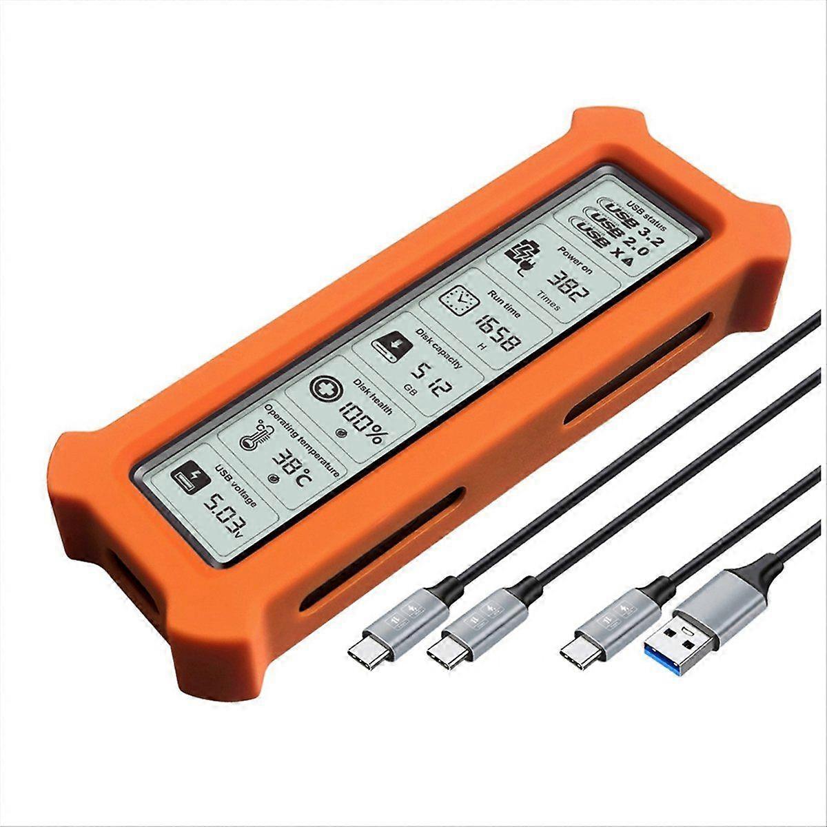[ and NVMe dual protocol] Support M Key (NVMe protocol)/M&B Key (NVMe and protocol) SSD, incompatible with B Key SSD, With USB C to USB C and USB C to USB A cable. [HD Screen Design] Come with HD display to monitor your hard drive usage in real time. Display content includes: USB operating speed, cumulative number of hard disk power-on times, cumulative hard disk operating time, total hard disk write volume, real-time health monitoring, operating temperature, USB voltage.The datas on the display allow you to monitor the usage of the hard disk more directly,When your hard drive health is below 100%, you need to attention to backup data in time. [10Gbps Supper Speed] USB3.2 Type C NVME enclosure transmission speed is up to 10Gbps, After installing the SSD, the read and write speed can reach 1000-1200MB/s.And HD movie transmission only takes 2 seconds. The perfect data transfer and backup solution. Backward compatible with USB 3.1 Gen1 and USB 3.0 with speeds up to 6 Gbps. [SUPPORT MULTIPLE OPERATING SYSTEMS] is engineered with USB 3.2 Type c interface, support hot-shippable, Plug and Play, No Driver required.This external hard disk box is suitable for connecting computers, Smartphones, laptops and other devices. Please note, all new solid-state drives must be formatted before use. [Strong Heat Dissipation] M.2 adapter adopts aluminum alloy shell, slim design, and excellent heat dissipation. [Wide Compatibility] This compatible with in sizes 2230 2242 2260 2280, such as M.2 SSD; For the System, NVME Enclosure support Multi OS, , for OS, Linux, Android. Product Name:M.2 Screen Display Hard Disk Case Supported Capacity:Supports up to 4TB hard drives Transmission speed:10Gbps External interface:USB3.2 Gn2 Type-C Specification:B: orange protective cover Color:As Shown Material:Aluminum ABS Package Contents: 1 * hard disk box 1 * silicone protective cover 1 * C-C data cable 1 * C-A data cable Only the above package content, other products are not included. Note: Light reflection and different displays may cause the color of the item in the picture a little different from the real thing. The measurement allowed error is +/- 1-3cm.