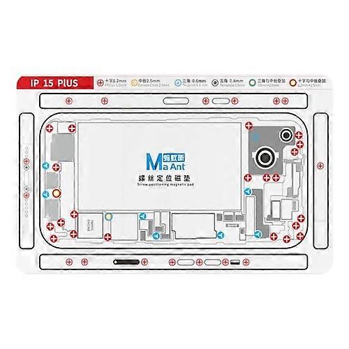 MAANT For iPhone 15 Plus Double-Sided Magnetic Screw Positioning Soft Mat Phone Repair Tool •Double-Sided Screw Positioning Flexible Magnetic Mat: Designed to store screws while accurately memorizing their positions for easy reinstallation •1:1 Screw Position Map: The magnetic mat features a 1:1 screw point map,allowing you to place the removed screws in their corresponding positions. This ensures a hassle-free and precise installation without the worry of misplacing screws •Secure Magnetic Design: Equipped with a magnetic surface to prevent screws from shifting,the mat offers just the right amount of magnetism. This ensures that screws stay securely in place while allowing for easy removal with a screwdriver Package included: •1 x Screw Positioning Mat