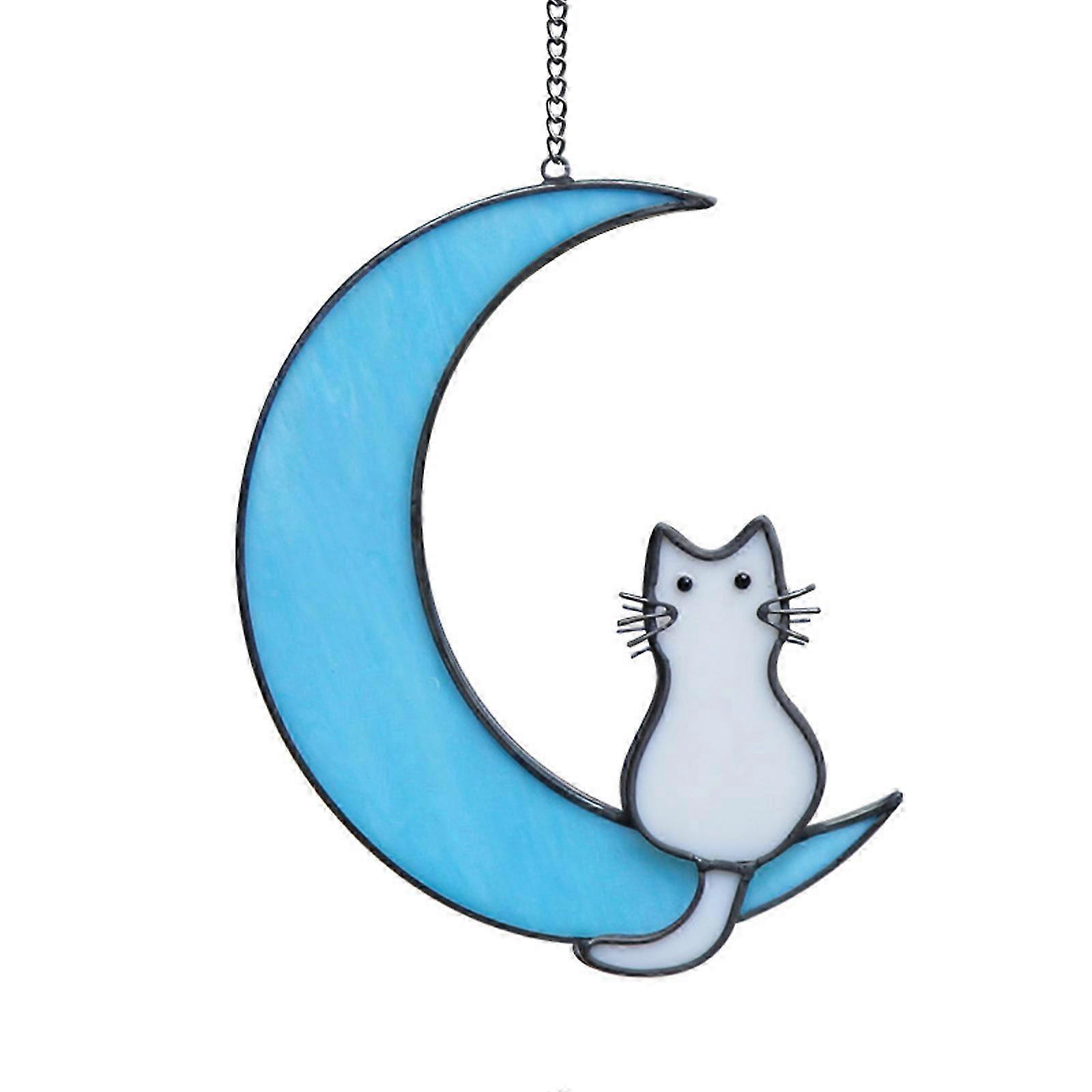 Moon Cat Stained Glass Hanging Ornament - Blue Window & Balcony Gift