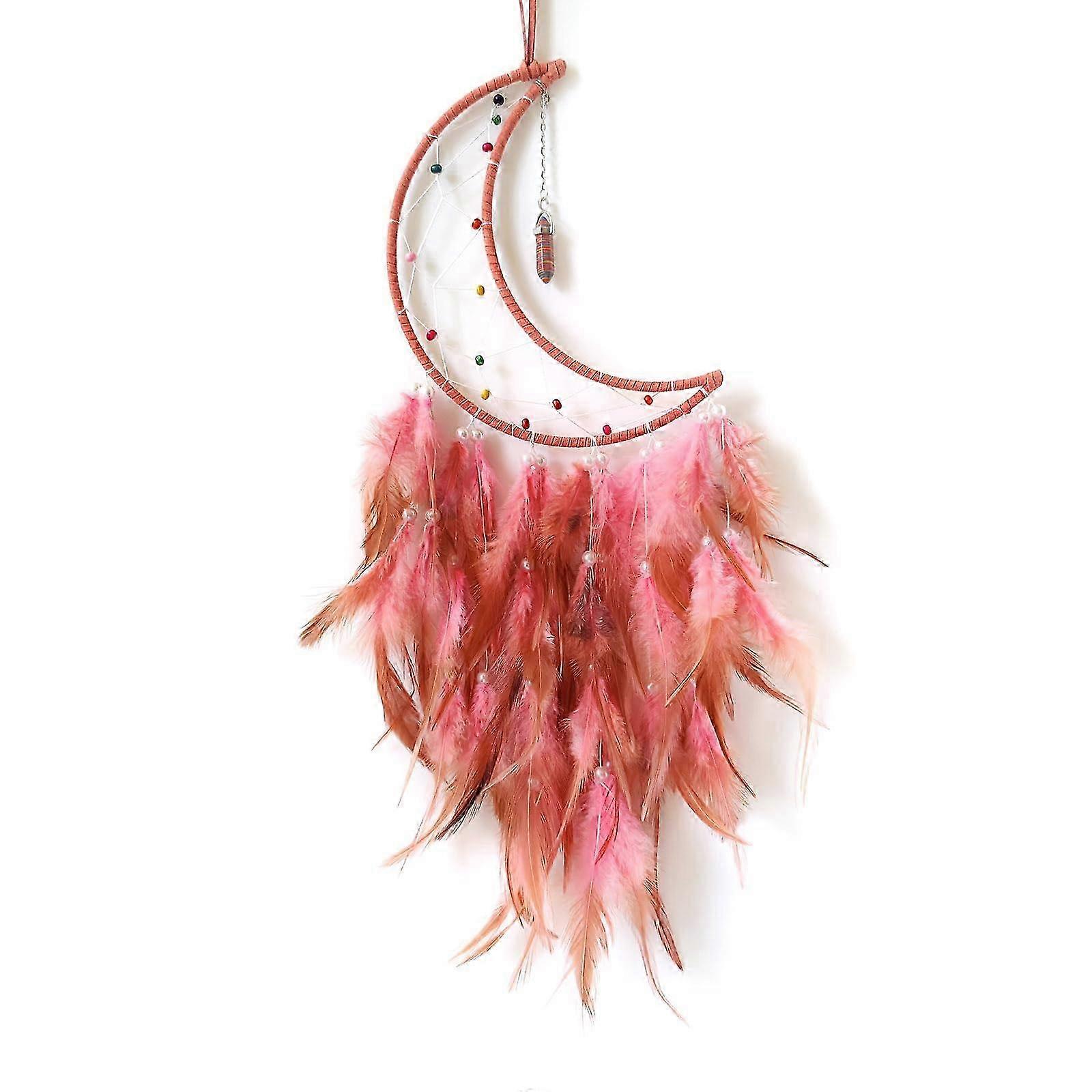 Moon Dream Catcher - Brown & Pink Feather Wall Hanging for Bedroom Gift