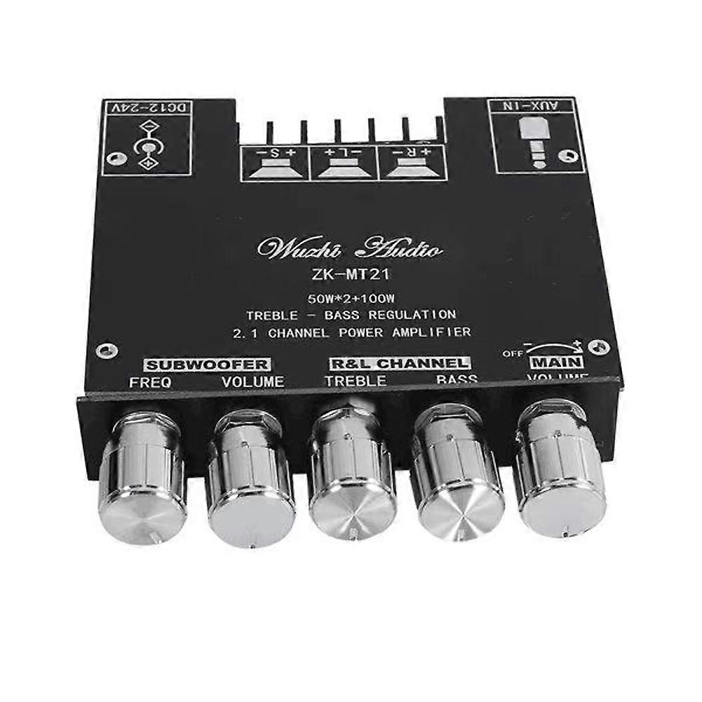 MT21 2.1-Channel BT AUX Digit Audio Power Amplifier Module High Power Sound Amp Suitable for 20-100W Horns This is a kind of quality audio amplifier module, which adopts quality electronic component, with accuracy process, which ensures fine durability and long service time. AUX+BT audio input, subwoofer+left and right channels output. Multiple protections design, reversed polarity, overtemperature, overcurrent and short circuit are protected. You can have a try. Features: Adopts quality electronic component, with accuracy process, which ensures fine durability and long service time. Fine contact performance, that ensure stable working. AUX+BT audio input, subwoofer+left and right channels output. Adopts quality chip, unfiltered output, with standard sound quality. Built-in 36*25*10mm cooling fin, with fine heat dissipation effect. Multiple protections design, reversed polarity, overtemperature, overcurrent and short circuit are protected. Specifications: Name: Power Amplifier Module Material: printed circuit board Model: ZX-MT21 Audio input: AUX+BT Voltage: DC12-24V Channel: 2.1(50W+50W+100W) Current: >9A R&L speaker: 4-8Ω; 15-100W BT: 5.0 Subwoofer: 4-8Ω; 15-100W Subwoofer frequency: 20-200Hz Item size: 93 * 90 * 22mm / 3.66 * 3.54 * 0.87in Item weight: 130g / 4.59ounce Package size: 100 * 100 * 30mm / 3.94 * 3.94 * 1.18in Package weight: 185g / 6.53ounce Packing List: 1 * Power Amplifier Module