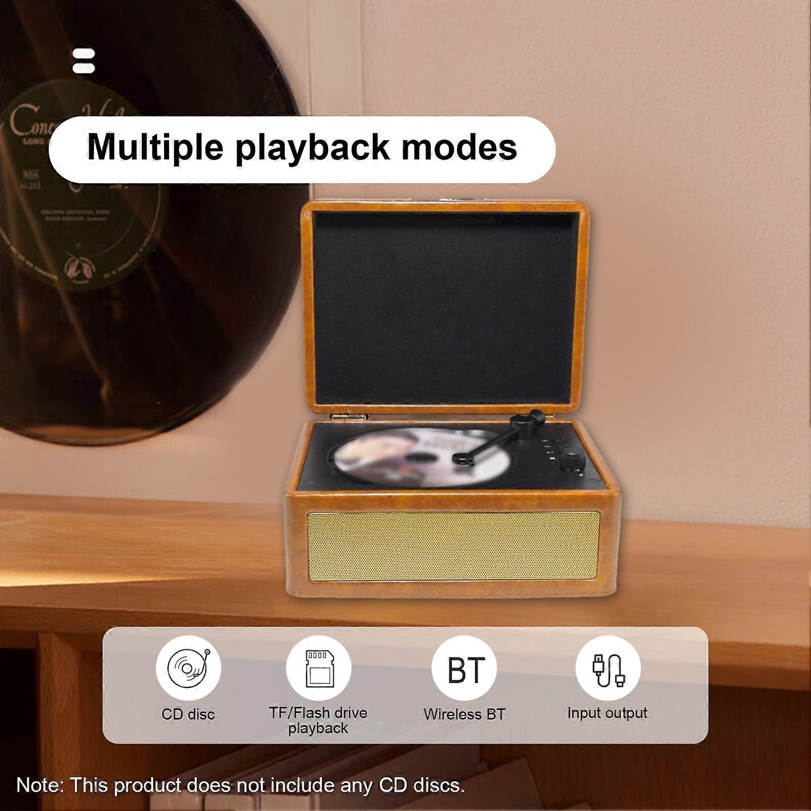 CD Player Multifunctional Tray Type BT Cassette Record Player Sound Turntables High Fidelity Sound Quality USB Drive Playback Infrared Remote Control with 2 Built in Speakers Wireless Music Streaming Specifications: Rated Power: 5W  Rated Frequency: 20HZ-20KHZ Disc Insertion Method: Tray type Speaker Interface: 3.5 input interface/3.5 output interface Rated Voltage: 5V Battery: 2000mAh Battery Usage Time: Approximately 6-8 hours Product Material: Wood+ABS Product Size: 20.5 * 16.5 * 10cm/8.1 * 6.5 * 3.9inch Item Weight: 1232g/2.7lb