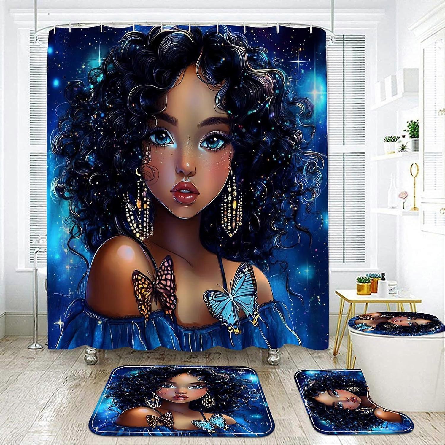NEWSUYAA 4Pcs Black Woman Shower Curtain Set with Bath Rugs - Rustic African Afro Girls Waterproof Tub Curtains & Rug Mats, Toilet Seat Cover Hooks,