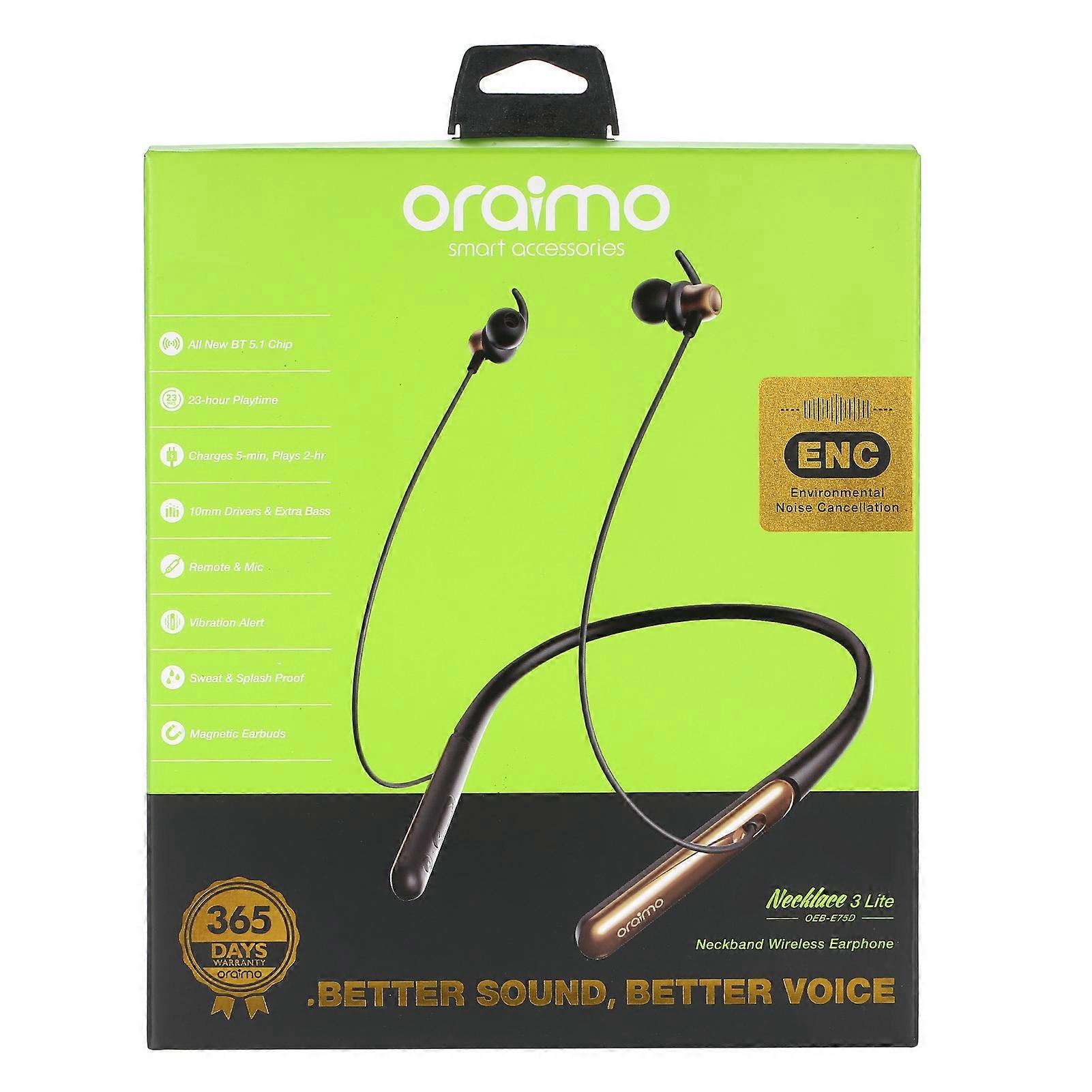 Product Description: Oraimo OEB-E75D Necklace 3 Lite Neckband Wireless Headphone Deep Bass Experience: Dive into an immersive audio experience with finely tuned 10mm NdFeB speakers. These speakers deliver powerful, deep bass, enhancing your music with a richness that brings it closer to Hi-Res Audio quality. The advanced BT5.1 chip ensures a stable connection, allowing you to enjoy uninterrupted sound. Advanced Noise Cancellation: Communicate clearly with the help of ENC technology, which detects your voice and suppresses 90% of surrounding environmental noise. This feature reduces noise by more than 35dB, ensuring that your voice is heard clearly during calls, no matter your environment. Ergonomic and Stylish Design: The neckband is crafted from a flexible silicone covering and a memory steel core, providing an ergonomic fit that maintains its shape. The electroplated finish not only adds durability but also makes a stylish statement, ensuring you stand out in any crowd. Convenient Magnetic Earbuds: Each earbud is equipped with a small magnet, allowing you to easily wear the earphones around your neck when not in use. This design ensures quick access and prevents the risk of losing them, making them perfect for on-the-go lifestyles. The Oraimo OEB-E75D Necklace 3 Lite Neckband Wireless Headphones are designed for those who demand superior sound quality, effective noise cancellation, and a stylish, ergonomic design. Ideal for sports, gaming, and everyday use, these headphones elevate your audio experience to new heights.