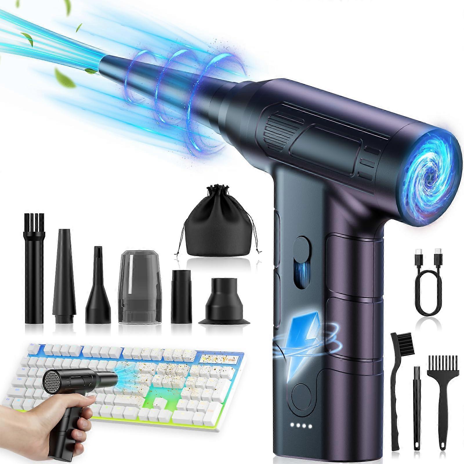 1.POWERFUL DEEP CLEANING: No place for small dirty things to hide and no need to dirty your hands. Compressed air duster uses a brushless motor, a longer life. The maximum speed can reach 150,000RPM, the top wind speed can reach 45m/s, and the wind force of up to 3.4OZ (upgraded the internal structure to make the wind speed stronger), powerful performance, its stepless control allows you to precisely adjust the speed to meet all your cleaning needs; can easily clean 99% of dirt hidden in various gaps on the keyboard or any electronic devices, extremely convenient to use in the home, office or car duster 2.D BLOWING / SUCTION MULTI-FUNCTIONAL: Prepare to be amazed by the unparalleled cleaning prowess of this air duster. Unlike other compressed air dusters, our upgraded version features a powerful vacuum nozzle that makes quick work of dust, dirt, and debris in the most stubborn corners. The suction mode includes a small dust collection cup, preventing dust and debris from scattering. Say goodbye to difficult dust cleaning and enjoy a simple, effective solution 3.ALTERNATIVE TO COMPRESSED AIR: Compared with compressed air can, our cordless air duster is rechargeable and used repeatedly, solving the troubles of daily cleaning without liquid or ice formation during cleaning. It protects your electronics from liquids, making it and energy-efficient. Its long-lasting and durable design reduces the need for frequent replacements; And the dust blower is equipped with a type-C cable (without adapter), which can be fully charged in just 2.5 hours, providing 15 to 120 minutes of usage time. With just a one-time investment, it caters to your everyday cleaning. Your wallet and Mother Earth will thank you 4.PORTABLE ELECTRIC AIR DUSTER: This portable air duster is crafted from high hardness, heat-resistant materials, compactly designed to be 35% smaller and weighing only 0.48 lbs, smaller than your phone. It's tiny enough to fit in your pocket. This mini jet blower boasts strong explosive force, good durability, low noise and long life. With its ergonomic shape and cordless design, can be easily placed in pockets, drawers, or inside cars, and cleaned of dust and debris anytime, anywhere 5.10-IN-1 MULTI-USE COMPUTER CLEANING KIT: The powerful mini blower comes with 5 different Nozzles 1 Filter cup 3 Brushes 1 Storage bag, specially designed for cleaning different areas. It can deeply clean hard-to-reach dust such as keyboards, PC cases, and cars. It can also be used for outdoor picnics to blow fires, dry hair (of people and pets), and remove snow and leaves from the surface of the car. It's also a go-to for DIY assembly and inflating air mattresses or life rafts. Discover endless possibilities and explore its versatile applications.