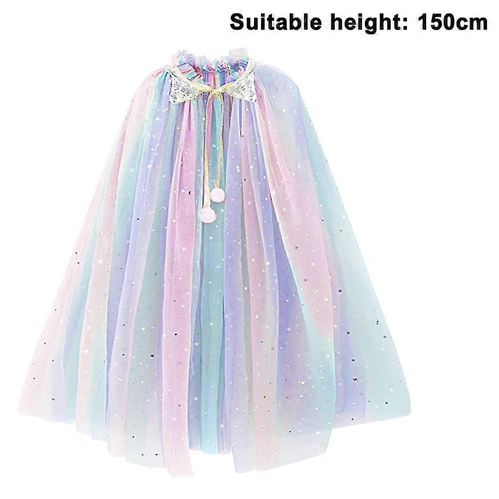 Product Description Material: polyester fiber Size: 70 cm long, 75 cm long Style: 140 cm, 150 cm Closed style: Lace-up strap Color: Rainbow Silver Quantity: 1 piece Package content: 1*cloak 1.Elegant design: 1 layer of colourful transparent tulle design, breathable and soft, decorated with shiny stars and moons, and a self-tie at the neck can be tied with a cute and cute bow that is easy to put on and take off. 2.Material: Princess cape is made of polyester and tulle, breathable and comfortable to wear, does not itch the girl's sensitive skin and offers her the best comfort. Please wash and dry by hand in cold water, do not bleach. 3.Two sizes: The colourful princess coat has 2 sizes, 70 cm , 750cm, suitable for height from 140 cm to 150 cm. It can be used as an ordinary cape for the daily clothes of girls or as a perfect accessory for many princess costumes. The cape could match all princess dresses, and other dresses, whether formal or informal, make your children like a princess in a fairy tale. 4.Application: suitable for banquet dresses, fairytale role play, Cinderella princess performances or daily life, play in amusement park, princess dress, children's day, Christmas, Halloween, cosplay, birthday party and pageant and other occasions. Make them stand out from friends. This princess coat can fulfil the dream of a little princess. 5.Creative accessories: Suitable for girls aged 3-6 years. It is a creative decorative accessory for charming girls indoors and outdoors, wonderful useful gifts for her. Your little princess would like to scream when she opened the gift bag, she would be a pretty princess.