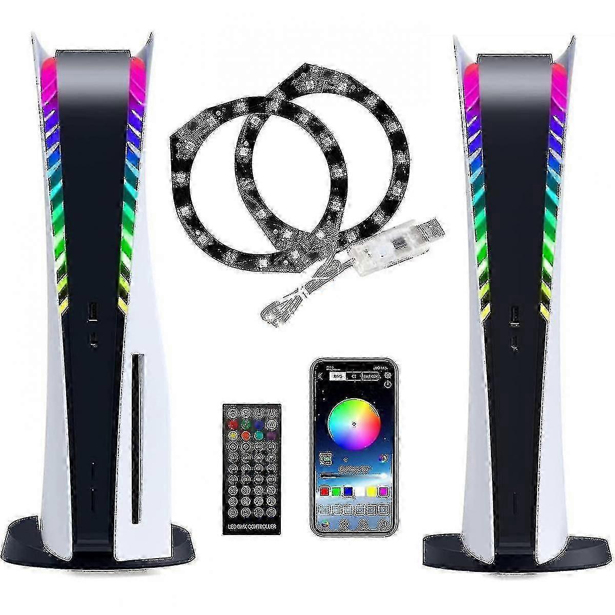 About this itemBest LED Accessories for PS5PS5 LED Light Kit that are truly perfect for PS5 console. The shape and size of the light ring is integrated with the cooling fan frame, our LED light thin and convenient enough, will not block any heat dissipation holes, and super simple and fast to install.Making Your PS5 Stand OutOur PS5 LED light kit sure to make your friends says together, Thats so cooooool 400+ LED lights effect modes, 8 kinds of colors light, game sound sync color changing, self-selected music sync color changing, various DIY LED modes of RGB free combination.Control Mode as You WishUSB switch, 40-key IR remote controller and smart APP control. Our Playstation 5 LED Lights not only let you to experience unique lighting visual effects, but also to meet all your DIY needs for RGB LED lights by adjusting the colors, light speed, brightness. The APP even includes a music mode and a microphone mode, so that each of your games can now have a unique BGM light.Product UpgradeMake of the Aluminum metal ring and 15Pcs high-end 5050 RGB LED chip compared to the 2835 chip and tape used in most LED strips, our PS5 LED light color is more colorful, brighter, stable and durable. Good heat dissipation, Keep the console cool during use, will not damage the PS5 console. Perfectly solves the problems of traditional LED light strip such as installation difficulties, heat dissipation difficulties, and single light-emitting control mode.Package Contents2 x RGB LED light ring with USB switch, 1 x 40-key remote control, 8 x adhesive stickers, 1x user manual. Tips: Please read the user manual before use, and test the product before installation; Our RGB LED ring kit compatible with both Digital and Disc Edition, It is powered by the DC 5V console USB interface, can be directly connected to the PS5 console, please do not plug into the larger DC power supply interface. Our products are made with the highest quality materials and are designed to provide you with the best possible user experience. We strive to ship out all orders within three days of purchase, and the estimated delivery time is 8-65113 days. When shopping, please pay attention to the size and dimensions of the product to ensure that it meets your needs. In the title and , we have provided detailed information about the product, including its features and specifications We want you to be completely satisfied with your purchase, so if you have any questions or concerns, please dont hesitate to con-tact us. We are here to help and will do our best to assist you. Thank you for choosing our product. We hope you enjoy it