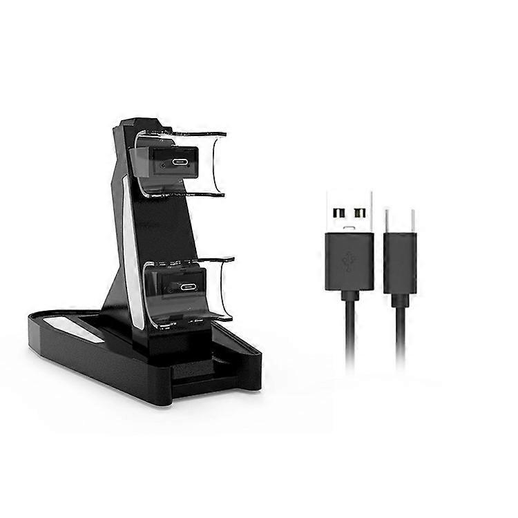 Sleek and Compact--This dual PS5 controller charger provides an easy and quick way to charge and store your PS5 Controller. Ideal for saving your place to store your PS5 wireless controllers in the charger when you're not playing Safe and Fast Charge--With 2 built-in Type-C ports, allows you to securely store and charge up 2 PS5 controllers simultaneously. One controller just needs 2 hours.  LED Charge indicator--USB cable connects the power the PS5 Charger Stand turns to blue color, plug in the controller turns to red color, charged fully turns to blue color again Excellent Chip Design--Built-in protector chip, you never worry about Over-Charging/Over-Heated/Over-Current/Over-Voltage/Short-Circuit/Over-Discharger. How to provide you with a safe and durable Ps5 charger is our eternal pursuit Specification: Current: Single charge: 550mA, dual charge: 1100mA Input/output: 5V±2.5