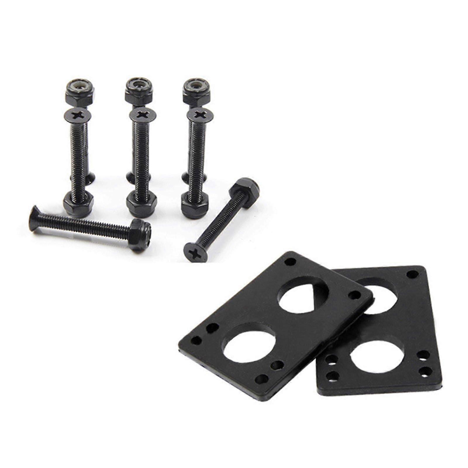 Product Details describe: Application: r pad/screw set for longboards and skateboards, available in a variety of options. r Pads: Skateboard r Shock-absorbing pads reduce the impact from drops and bumps. The contact between the wheel and the skateboard can also be avoided when modifying the big wheel. Material: The longboard mat is made of PU, which has good cushioning properties and helps absorb most of the impact, durable and practical. Carbon steel durable hardware. High-strength steel components are durable and provide a stronger connection. REPAIR ACCESSORIES: This set is a great accessory for repairing your skateboard. Make your movements smoother. The perfect tool for outdoor sports skateboarding, enjoy happy sports time. Specification: Weight: spacer 45g, bridge nail 80g Dimensions: 6mm spacer 35mm bridge nail Quantity: 1pcs Material: PU+carbon steel Colour: Black Package: 8*screws, 8*nuts, 2*washers notes: 1. Due to light and screen differences, the item's color may be slightly different from the picture. 2. Please allow 1-2cm differences due to manual measurement.