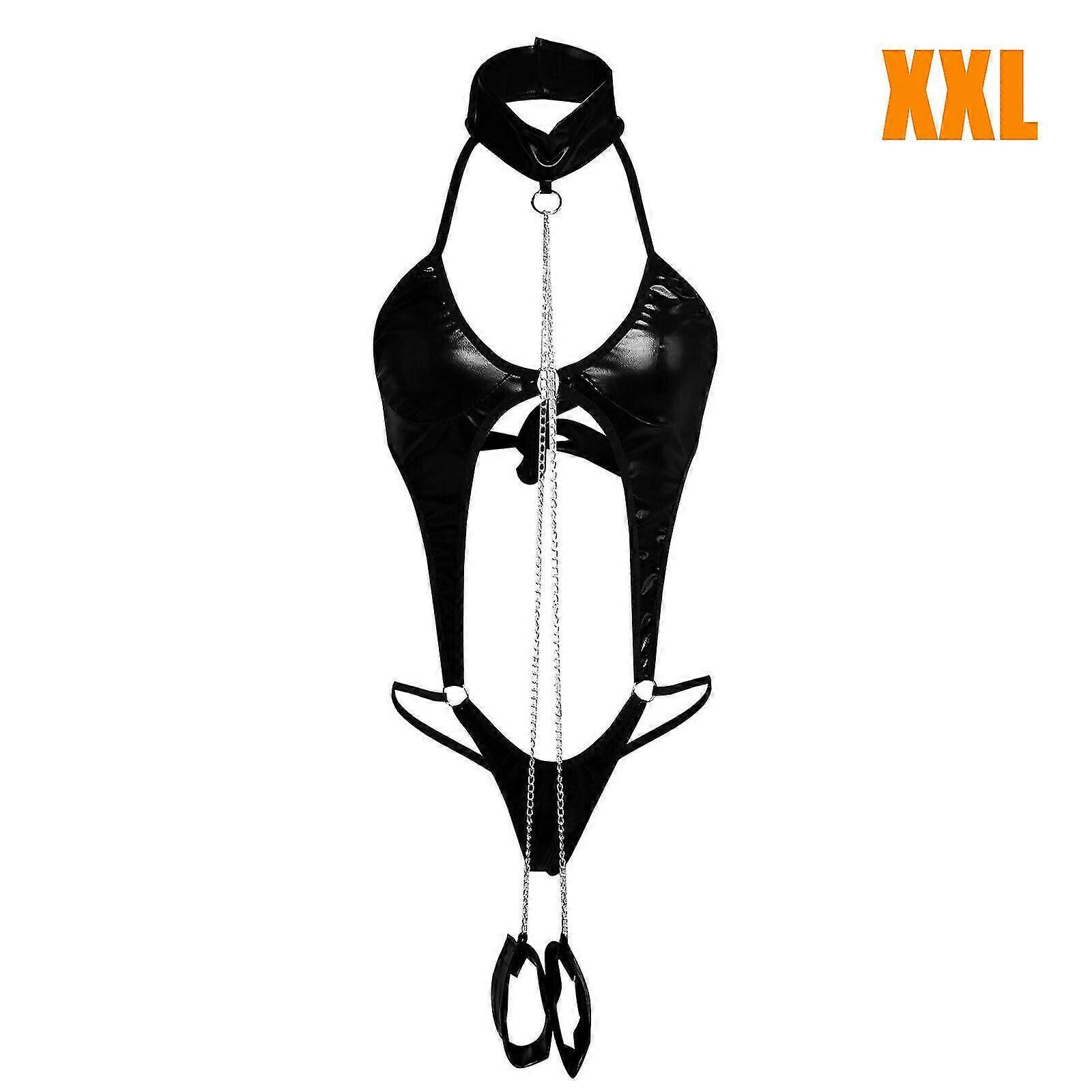 Womens Sexy PU Leather Lingerie Chain Bra Thong G-String Jumpsuit Underwear