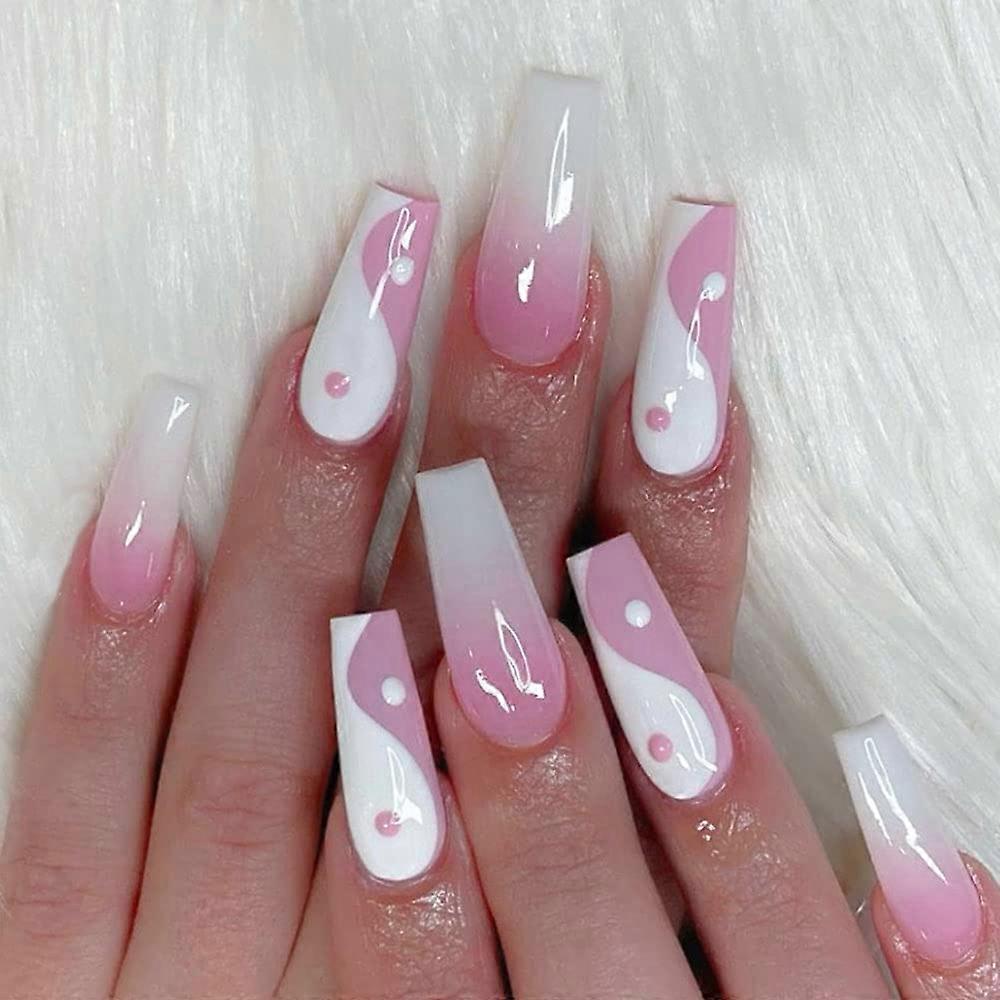 QQDD Women's Pink Acrylic Fake Nails Chinese Design Prom Tai Chi (24 Pieces)
