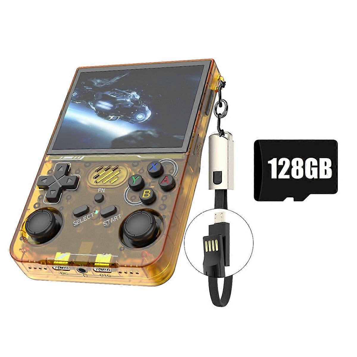 Built-in emulator: for MAME/N64/PS1///FC/SFC//CPS1/CPS2/CPS3/, etc. Resolution: 640x480 Built-in lithium battery: 3000 mAh Type:R36XX Retro Handheld Game Console 128G 30000+Games 3.5 Inch Screen Due to different batches, there may be differences in product appearance, color, and printed text, which not affect the use. Color:B:Transparent Orange Material:plastic Package Contents: 1 * Game Console Only the above package content, other products are not included. Note: Light reflection and different displays may cause the color of the item in the picture a little different from the real thing. The measurement allowed error is +/- 1-3cm.