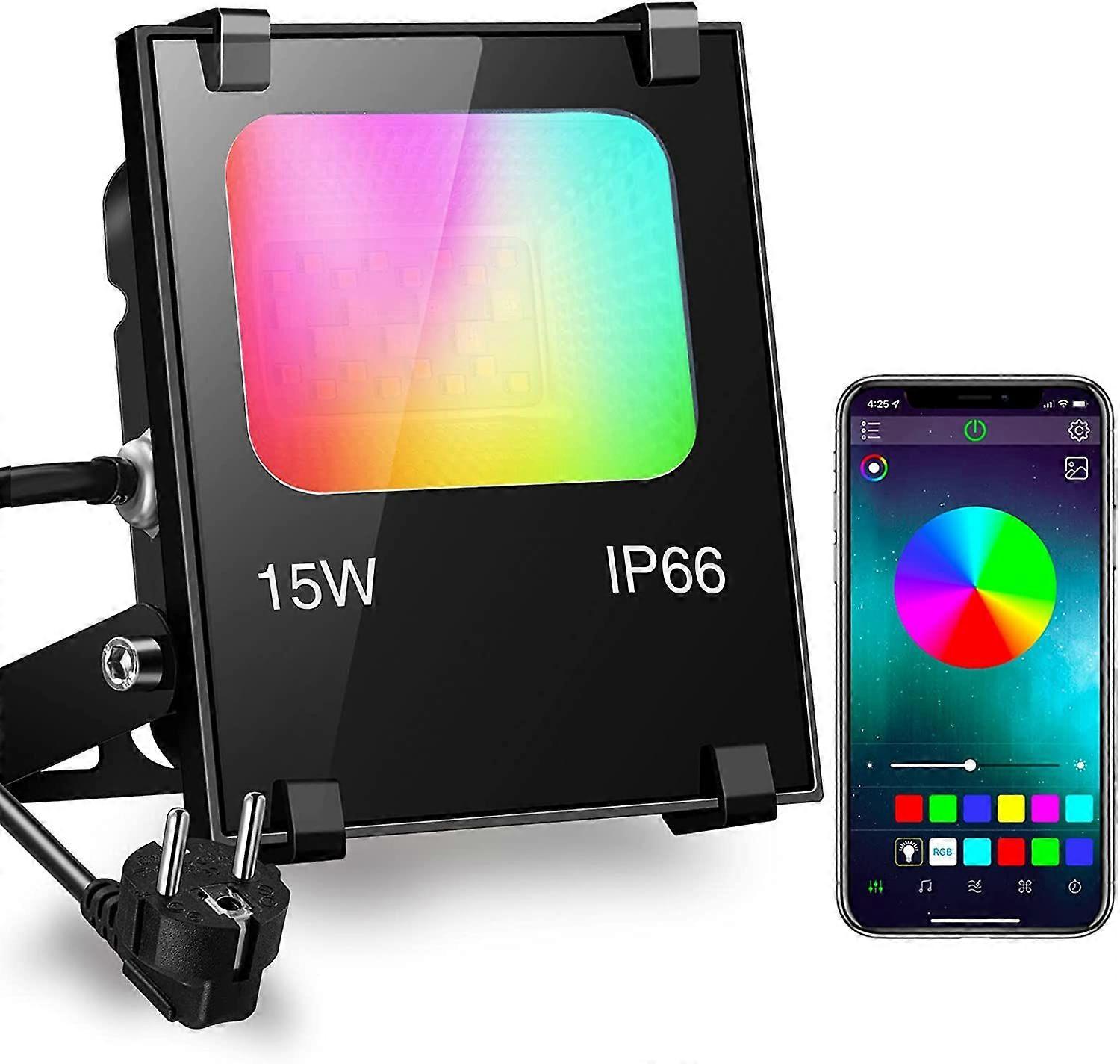 RGBW Projecteur LED Exterieur 15W contrl par smartphone, Intelligente RGB Spot LED de Couleur, IP66 Etanche, 20 Modes 16 millions Couleurs, Puissant L