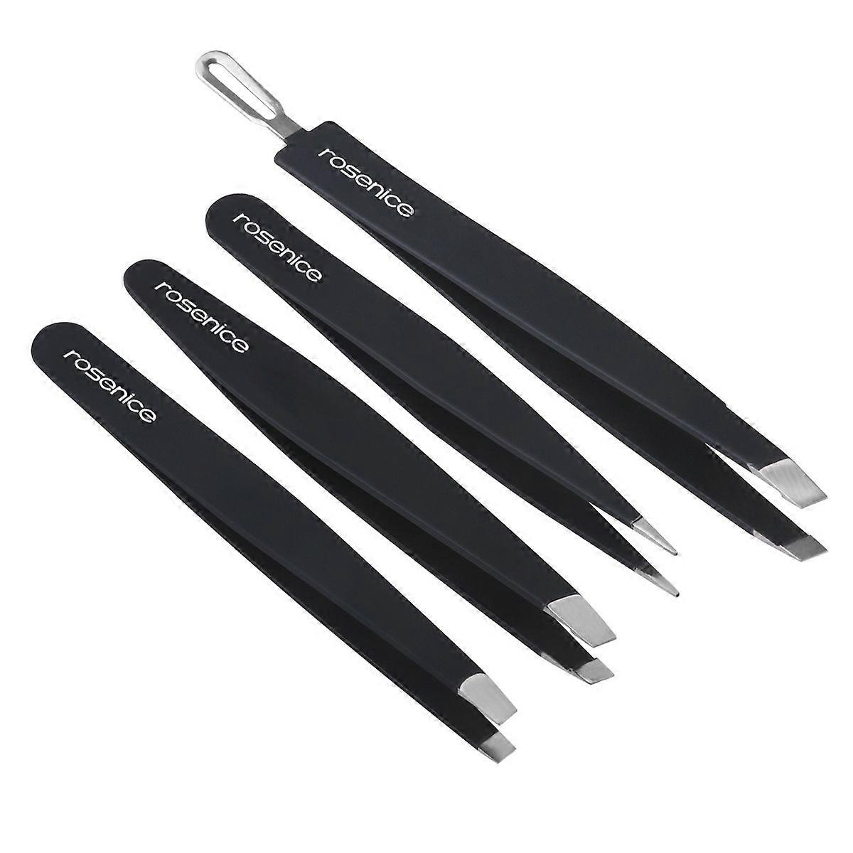 Rosenice 4pcs Professional 401 Stainless Steel Slant Tip Tweezer Best Precision Eyebrow Tweezers Kit with Rubber Painted (Black)