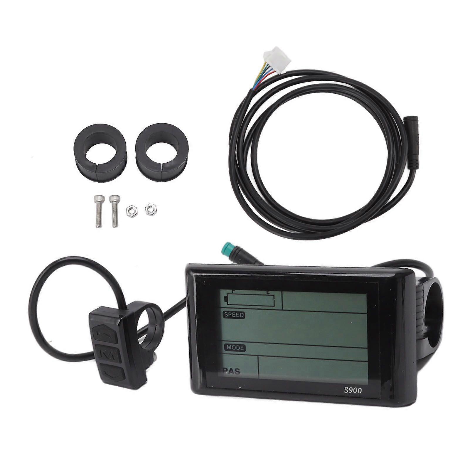 Features1LCD Screen: LCD display makes it easier for you to view the data on the panel and the status is more intuitively displayed on the large screen. 2Real Time Recording: Compatible with 24V, 36V and 48V voltage, truly reflecting the battery power, recording the power consumption in real time and ensuring the riding mileage. 3Function: Display will show many useful data of your bike, such as remaining charge, current speed, average speed, maximum speed, clock, total and one way distance. 4Waterproof Design: 5 pin waterproof interface, waterproof controller and normal controller can be matched to use. 5Characteristics: Easy to install and use for 22.2mm/0.87in diameter handlebars, durable PC material, and has a long service life.SpecificationItem Type:ElectricBicycleLCDDisplayMaterial: PCModel Type: S900Suitable for Handlebar Installation: 22.2mm/0.87in diameter handlebarVoltage: 24V 36V 48VPlug: 5 pinFunction Description:1. Display Function: Speed display, power gear display, power indicator, fault prompt, total mileage, single mileage, headlight display, single driving time display.2. Control and Setting Functions: Power switch control, headlight switch control, 6Km/h point control, wheel diameter setting, maximum speed setting, idle automatic sleep time setting, backlight brightness setting, voltage level setting, PAS connection.Package List1 xLCDDisplay2 x Gasket2 x Screw2 x Nut1 x User Manual