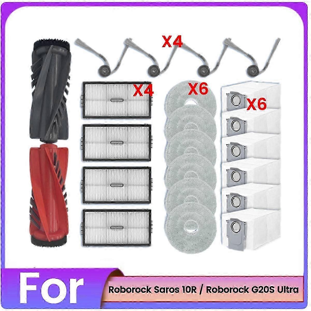 [Compatible Models]Specifically designed for the for Saros 10R/G20S Ultra , this comprehensive accessory kit ensures your vacuum operates at performance, maintaining its efficiency and extending its lifespan. [Perfect Compatibility]Designed specifically for the for G20S Ultra Robot Vacuum, this comprehensive accessory kit ensures a and easy installation, enhancing your vacuum's performance without the need for additional tools. [Premium Quality Materials]Experience exceptional cleaning with our kit that features a main roller brush and side brushes made of high-quality plastic rubber, and HEPA filters crafted from H13 grade filter paper that captures 99.97% of dust and debris, ensuring performance with equipment. [Tool-Free Installation]Enjoy a hassle-free replacement experience with our accessories that are designed for quick and easy installation, allowing you to maintain your for G20S Ultra Robot Vacuum with minimal effort and no additional tools required. [Dust Bags] Featuring a multi-layer filtration system, our dust bags capture 99.999% of fine dust particles. The robust sealed design prevents any escape of dust during disposal, keeping your surroundings clean. Compatible with model:For Saros 10R For G20S Ultra Colour:As Shown Material:plastic Package Contents: 1Pair x Main Brush 6 x Dust Bags 6 x Mop Cloths 4 x Filters 4 x Side Brushes Only the above package content, other products are not included. Note: Light reflection and different displays may cause the color of the item in the picture a little different from the real thing. The measurement allowed error is +/- 1-3cm.