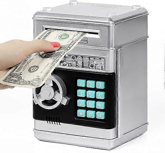 High Quality Materials:ABS plastic;Safe simulation design,no odor and sturdy and not break easily;An interesting piggy bank specially designed for children.(Applicable Batteries: 3 * 1.5V AA Batteries (not included).) Password Piggy Bank:Four electronic password protection,if you press the wrong password, it will be issued.Only be opened when you enter the 4 digit correct password,the green light will turn on then you can turn the knob clockwise and open the door.(Default: 0000,Changable passwords as you like). High-capacity Money Saving Box:This piggy bank can store 600 pieces of coins or 100 pieces of paper money.Make children to plan to store pocket money,greatly helping children develop a good habit of saving money. Automatic Paper Money Scroll:Insert the paper money into the slot on top of kids ATM money bank, it can be rolled into the ATM machine automatically.Easy for kids to use.(But it doesn't work if the paper is too old or too soft) . A Perfect Gifts:Kids will love to receive this Cool money saving bank.It's fun and educational and teaches the importance of saving.It's the best gift for your birthday Gift,Christmas Gift,New Year's Gifts,prize, reward, or any other holiday gift.(Recommended for ages 3+ Year Old.)