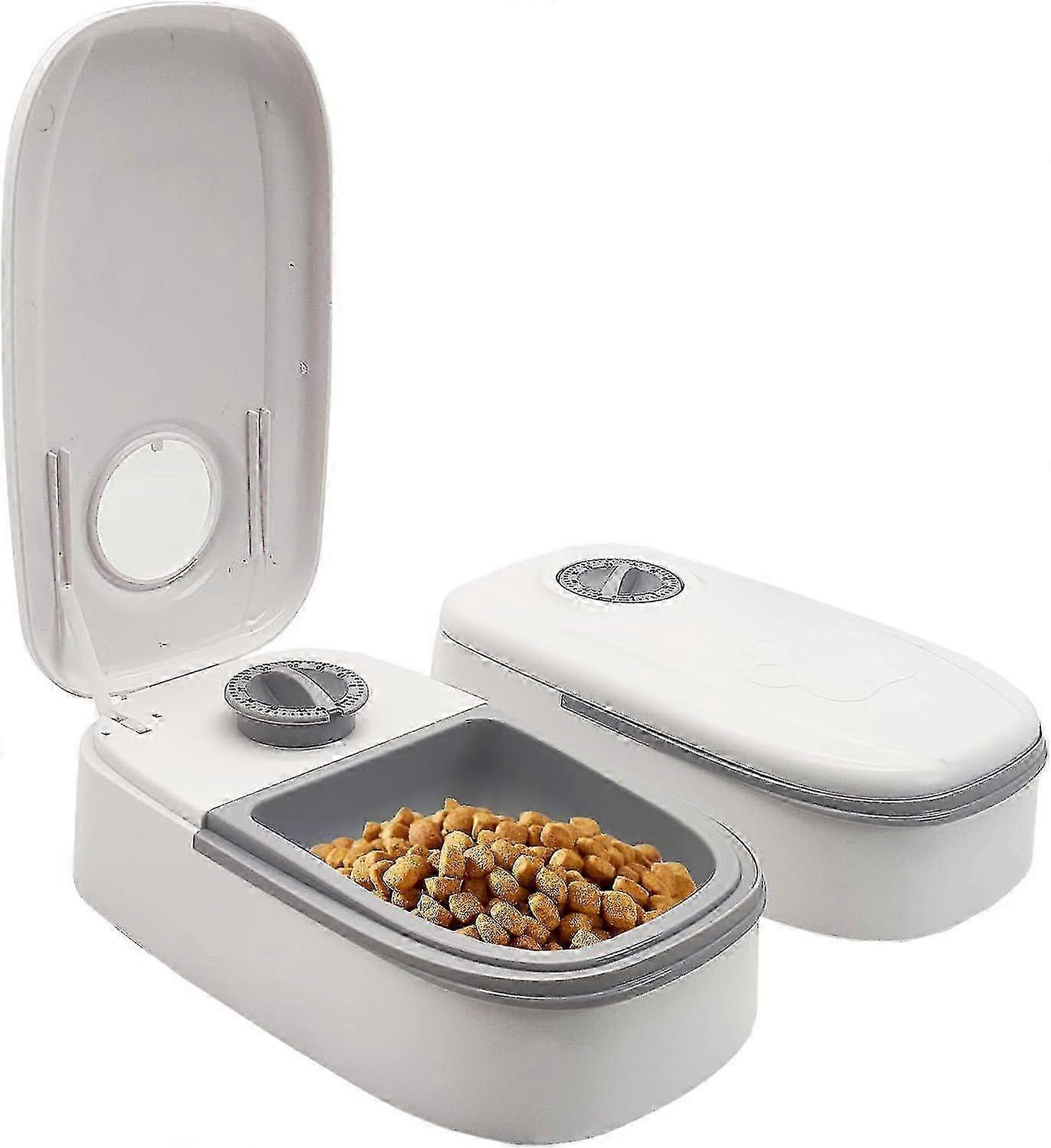 Keeping Food fresh Pet timer feeder is designed a space at the bottom for an ice pack that will keep food fresh at 0 C for eight hours. Great solution to the problem of wet and canned cat food, refrigerating after opening, and more difficult to prepare in advance. Give your pet regular access to fresh food. (Note: This product does not include ice pack, please prepare by yourself) Timed Feeding Puppy Feeder is designed with a quiet 48-hour timer to help your pets develop healthy eating habits. No ticking, will not disturb your good dream. Open the function on time, so that you can travel, party, work at ease, don't worry about the family pet will be hungry. Double Bowl Feeding The automatic cat feeder holds up to 12.4oz(350 ml) of dry or semi-wet food per bowl and is suitable for cats and small to medium sized dogs to help you with a regular ration feeding schedule. Tip: To prevent the lid from opening, do not place food or slime on the edge of the tray Preferred MaterialThe automatic cat feeder is made of environmentally friendly ABS material, safe and durable; Removable tray, easy to clean, just rinse with water. Note: 1 AA battery required (not included) Easy to Useeg:You want your cat to eat at 6:30 in the morning, now it's 22:30 at night, you need to set the feeder for 8 hours, you just point the button arrow at 8 and the lid will open automatically after 8 hours. This is a 48-hour timer. The number the arrow points to depends on the difference between when you set it and when you want it to open