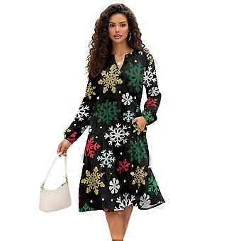 Jouluinen lumihiutalekuvioinen midimekko naisille, pitkähihainen, V-pääntie, joustava vyötärö, laskeutuva ja kevyt – koko L