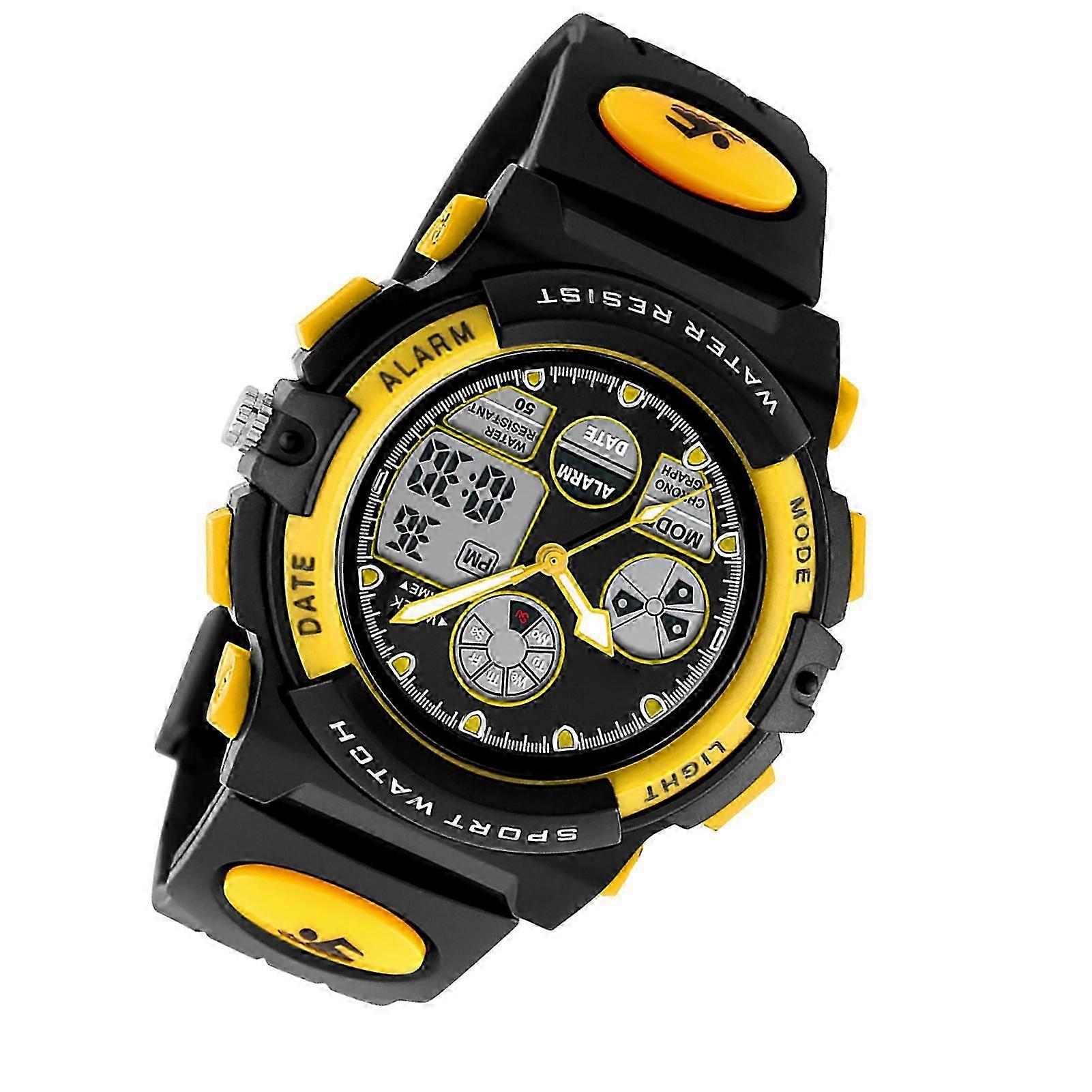 Features 1Optional Colors: There are various charming and beautiful colors for you to choose, especially bright purple, bright blue and camouflage blue. Pick up your favourite one or choose beautiful one for your kids. 2High-quality Material: This watch is durable due to PC-made case and highly transparent resin which is hard and pressure-tolerant. 3Multifunctionality: When you need a clock to wake you up, it can be alarm; when you want to know the date, it can be used as calendar indicator to show date and day; In addition, this watch has LED luminous, dual time capability and a chronograph function. 4Design for Children: Adjustable PU strap is comfortable to wear. Besides, it has wrist conservation design for children. 55ATM Waterproof: 50 meters waterproof makes you be able to wear it even in shower or swimming pool. But don\u0027t wear this watch for longtime underwater activities, such as diving, ect.. Watch life can be shortened by too much water contact or usage in extreme hot or cold temperature. 6Best Gift: With its practical functions and stylish appearance, it\u0027s a great gift for kids on their birthday, Children\u0027s day, etc.. Specification