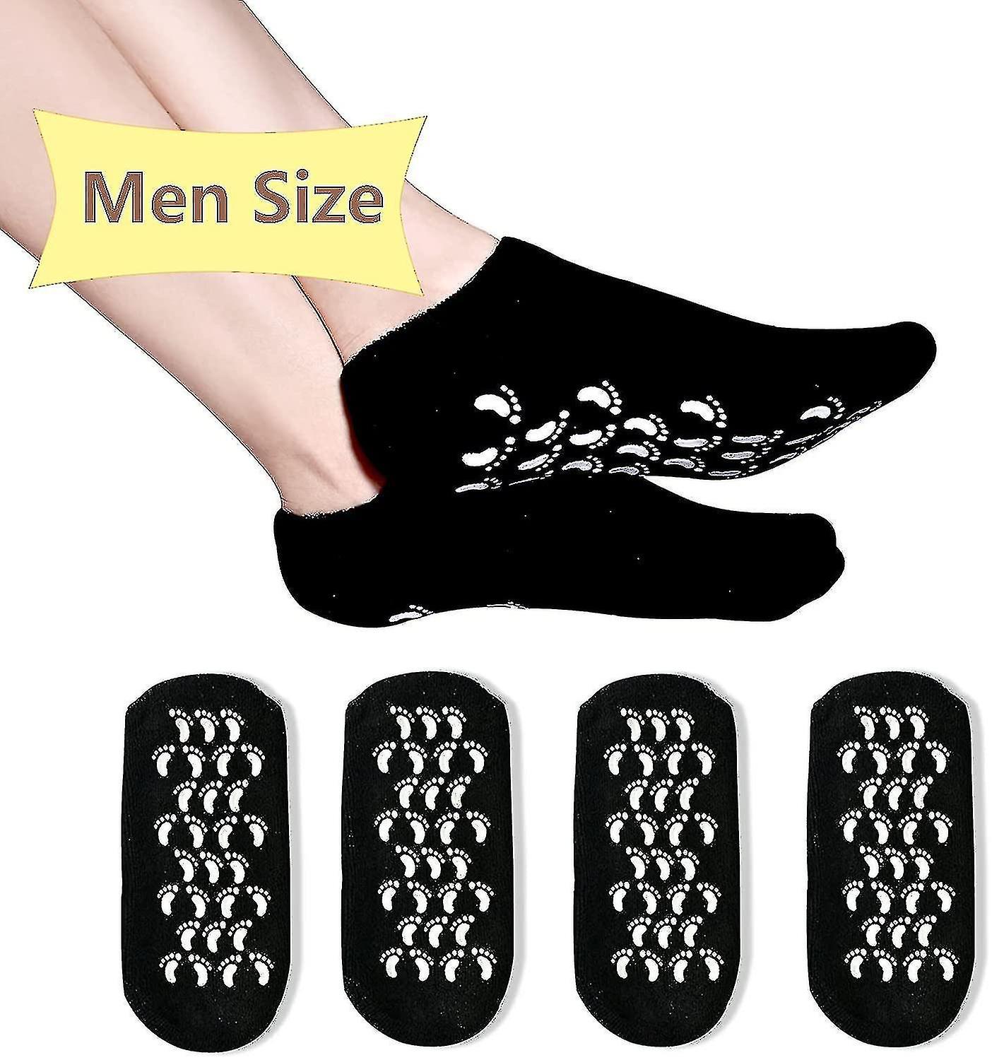 SOFT & COMFORTABLE MATERIAL -- Moisturizing Socks are made of Super Soft Cottond Spandex, the inner lining is added with durable, high quality medical-grade Gel, which is Enriched with Vitamin E and Essential Oils(jojoba oil, rose essential oil, olive oil, etc). They can continuously moisturize the skin to a natural and healthy look, nourish the smooth, and increase flexibility. Allergy Free.LOTION INFUSED SOCKS -- Compared with using moisturizing products alone, the gel lining speeds up and enhances the moisturizing process, which can quickly recover from hard, dry, rough feet, calluses, heels, toes and cuticles. And the moisturizing gel socks works best when combined with your favorite aloe or lotion.NON-SLIP GRAIN DESIGN -- Featured Non-Slip Dots On the Bottom of elastic gel socks provide good frictiond adhesionwhich can reduce the risk of slips and falls. It provides stability and safety for everyday use at home.DAY AND NIGHT FOOT CARE -- Spa Treatment at Home - Simply pull on our soft gel socks at home for a luxurious in-home conditioning experience for your feet. No longer need frequent trips to expensive spa salons. And they are washable and durable for repeated use.WHAT YOU GET-- 2pairs Black Moisturizing SocksFit For US MEN SHOES SIZE 7.5-10, which can be used alternately. And Our Worry-Free 18-Month Post-Sale Service and Friendly Customer Service Try It and You Will Love It