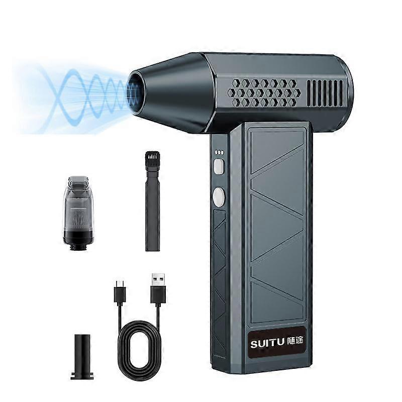 SUITU ST-8113 Outdoor Turbine Fan Home Lithium-ion Dust Blower Handheld Hair Dryer 1. Motor power: 160W 2. Motor speed: 130000RPM 3. Blowing force: up to 180g, 52ms 4. Vacuum degree: 43006800 5. Input voltage: 5V2A 6. Battery capacity: 18650 2500mAh x 2 7.4V 7. Charging time: about 2.5h 8. Use time: about 1h 9. Charging port: Type-C 10. Working temperature: -10 - 50 degrees Celsius 11. Charging indicator: the indicator light flashes when charging 12. Material: ABS 13. Size: about 14.8 x 10.6 x 2.5cm 14. Weight: about 329g Features: 1. Two gear modes, three-speed adjustment, stepless speed change 2. Adopt high-speed brushless motor, large duct turbine air supply 3. Can be used as a handheld fan, long-lasting battery life, strong wind 4. Lightweight and compact, easy to put in your pocket 5. Adopts Type-C charging interface, wider adaptability, more convenient charging 6. With a variety of accessories, corresponding to different needs, easily solve the problem of blowing and vacuuming dust