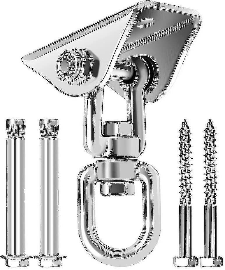 Description [Indoor and Outdoor Use]: Suitable for any weight on swings, rocking chairs, sandbags or hangers. 【Corrosion Resistant, High Hardness】: 304 stainless steel ring is made of high quality raw materials. No rust, no corrosion, high hardness, environmentally friendly and non-toxic. [Easy to Install]: We have drilled two holes, which can be fixed on wooden beams or concrete beams. The unique integrated design installs in minutes using 2 concrete anchors and 2 hex head bolts. Rotating design: The innovative design makes it more flexible and can be widely used, such as playground, swing, porch swing or ham swing. [SAFETY & STRENGTH]: Rely on these high-quality swivel hangers to safely support children and adults. Weight limit is 1000 lbs. This ceiling bracket does not rotate. Please check whether the ceiling is strong enough before installation. Load limit is 450 kg. Make sure the surface to be installed can withstand the weight and strength. Fasten to the concrete ceiling using only the fastening materials provided. Not suitable for drywall ceilings or other flexible building materials. Heavy-duty hook adopts heavy-duty hook design, and the hook can rotate 360 degrees in any direction. We installed 304 stainless steel O-rings to prevent shaft slippage. Plus, the hook and loop is strong enough to ensure safety. Quantity: 1 piece